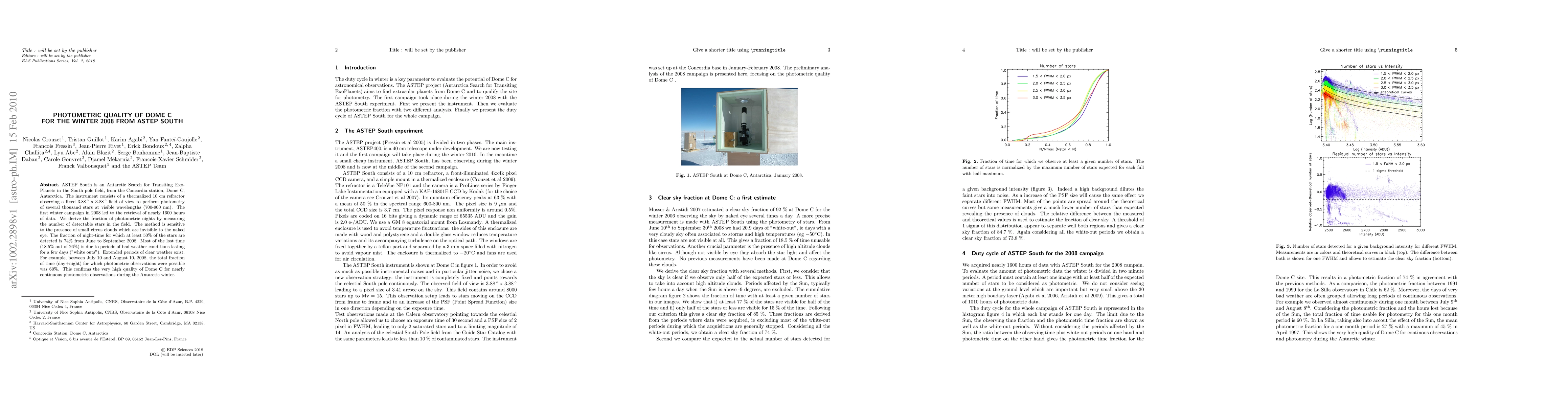 The ASTEP South instrument at Dome C, Antarctica, recorded nearly 1600 hours of photometric data during the winter of 2008, revealing 74% of nights suitable for observations when at least 50% of stars were visible, despite 18.5% of lost time due to weather conditions. Extended clear periods confirm Dome C's high quality for continuous photometric observations.