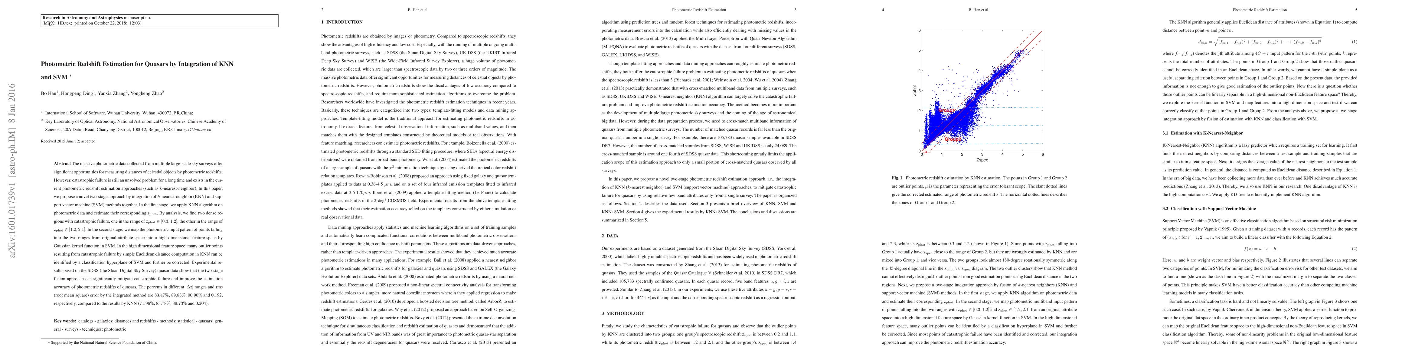 This paper proposes a two-stage method combining KNN and SVM to improve photometric redshift estimation for quasars, addressing catastrophic failure in current approaches. The KNN method identifies dense failure regions, while SVM in the second stage corrects these by mapping data into a high-dimensional feature space, significantly improving accuracy.