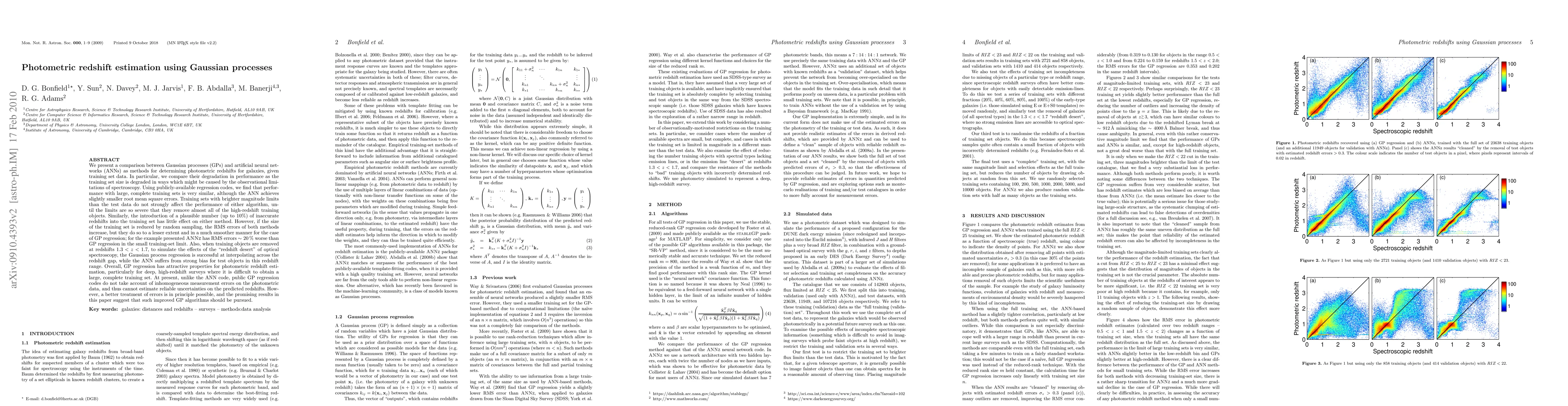 This paper compares Gaussian processes (GPs) and artificial neural networks (ANNs) for estimating photometric redshifts, finding that GPs perform more smoothly as training set size decreases and can better interpolate across redshift gaps, making them particularly suitable for deep surveys. However, current GP methods lack error estimation capabilities.