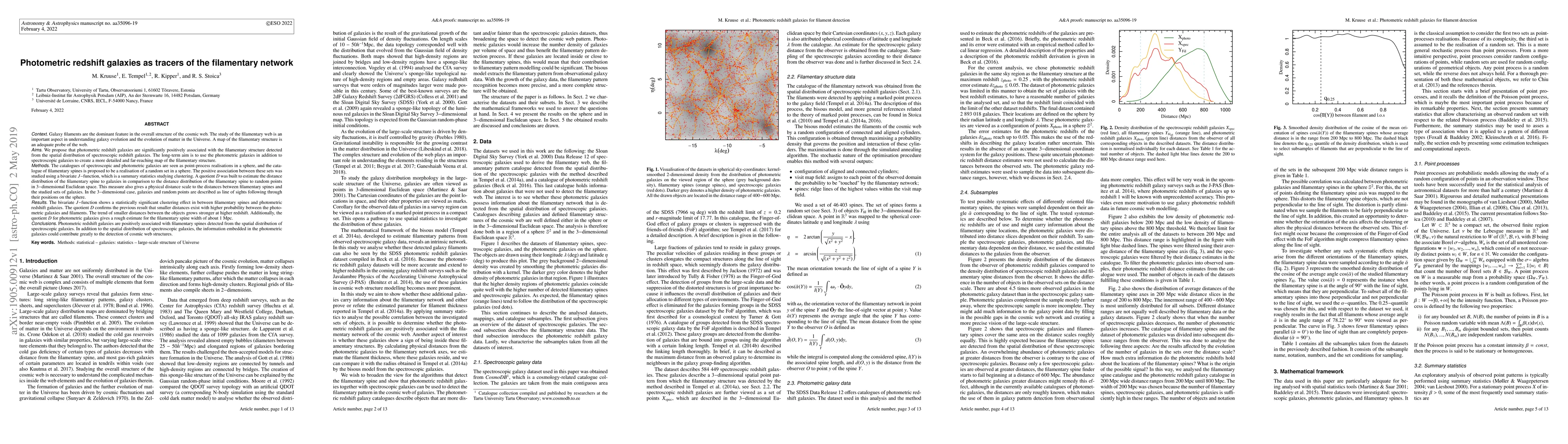This study used spatial statistics tools to analyze three datasets: spectroscopic galaxies, photometric galaxies, and filamentary spines. The data was treated as point-processes and random sets, respectively, and analyzed using summary statistics and estimation techniques.