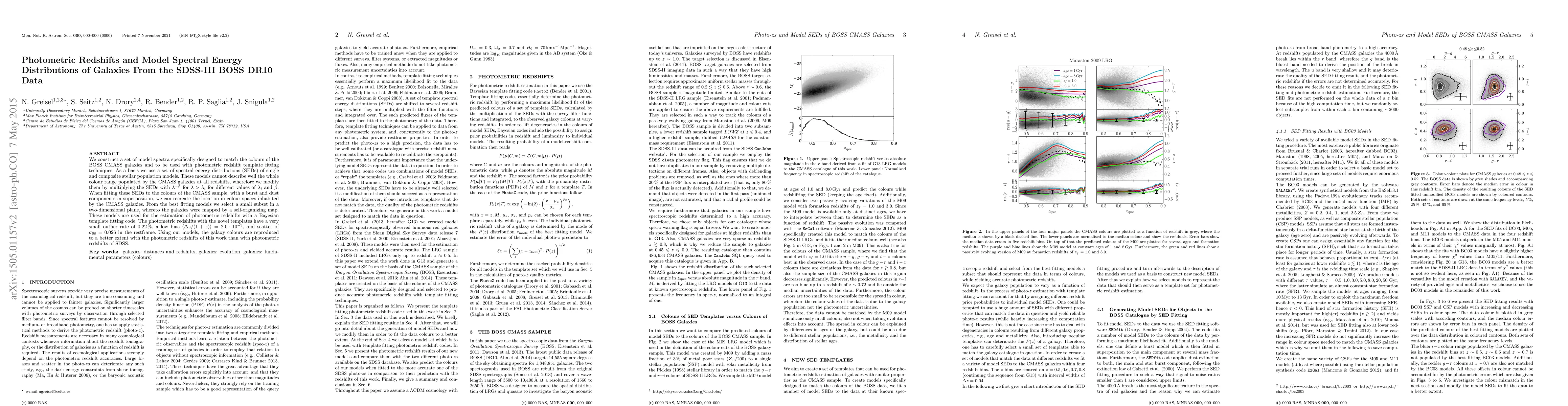 We construct a set of model spectra specifically designed to match the colours of the BOSS CMASS galaxies and to be used with photometric redshift template fitting techniques. As a basis we use a set of spectral energy distributions (SEDs) of single and composite stellar population models. These models cannot describe well the whole colour range populated by the CMASS galaxies at all redshifts, wherefore we modify them by multiplying the SEDs with $\lambda^{-\beta}$ for $\lambda>\lambda_i$ for different values of $\lambda_i$ and $\beta$. When fitting these SEDs to the colours of the CMASS sample, with a burst and dust components in superposition, we can recreate the location in colour spaces inhabited by the CMASS galaxies. From the best fitting models we select a small subset in a two-dimensional plane, whereto the galaxies were mapped by a self-organizing map. These models are used for the estimation of photometric redshifts with a Bayesian template fitting code. The photometric redshifts with the novel templates have a very small outlier rate of $0.22\,\%$, a low bias $\langle\Delta z/(1+z)\rangle=2.0\cdot10^{-3}$, and scatter of $\sigma_{68}=0.026$ in the restframe. Using our models, the galaxy colours are reproduced to a better extent with the photometric redshifts of this work than with photometric redshifts of SDSS.