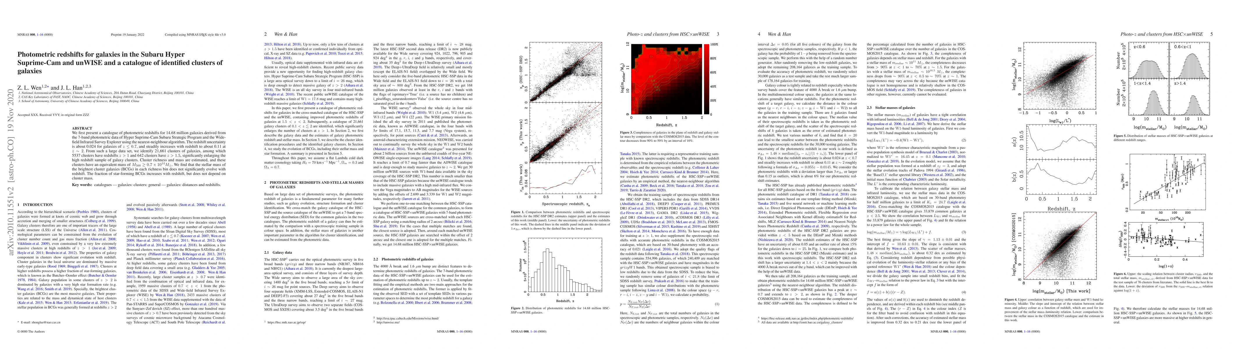 This paper provides a catalogue of photometric redshifts for 14.68 million galaxies using Hyper Suprime-Cam and unWISE data, identifying 21,661 galaxy clusters, including 5537 with redshifts greater than 1. The study finds that the stellar mass of brightest cluster galaxies does not significantly evolve with redshift, while the fraction of star-forming BCGs increases with redshift.