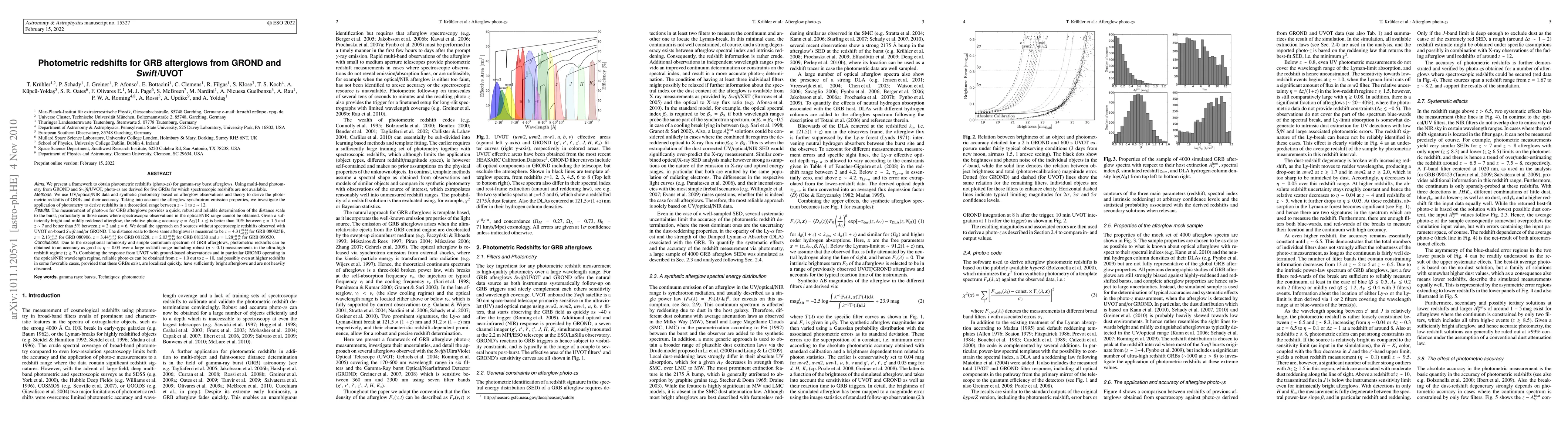 This paper develops a method for deriving photometric redshifts (photo-zs) for gamma-ray burst afterglows using multi-band data from GROND and Swift/UVOT. It provides accurate photo-zs for five GRBs without spectroscopic redshifts, achieving relative accuracy better than 10% for redshifts between z=1.5 and z=7.
