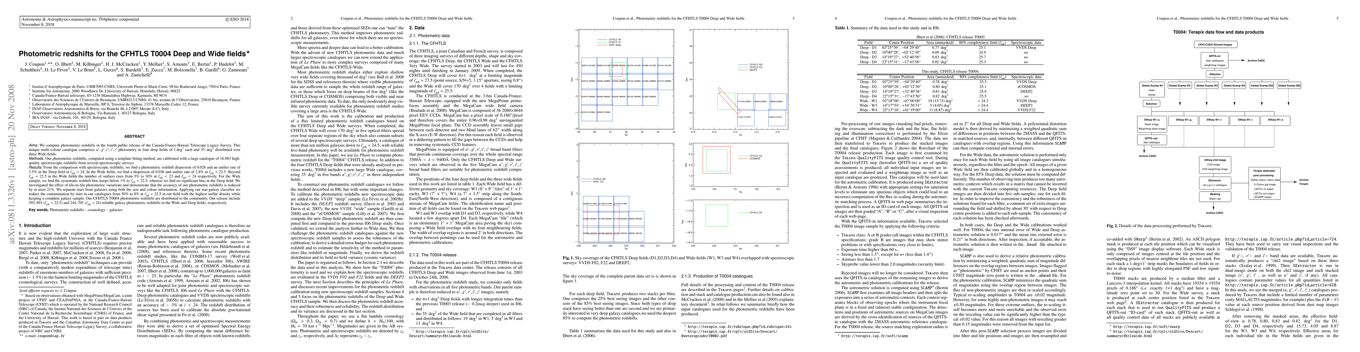 This paper presents photometric redshifts for the CFHTLS T0004 survey using template-fitting methods, calibrated against 16,983 spectroscopic redshifts. The study finds a dispersion of 0.028 and an outlier rate of 3.5% in the Deep field, with systematic bias below 1% up to i'AB < 22.5 in the Wide field.