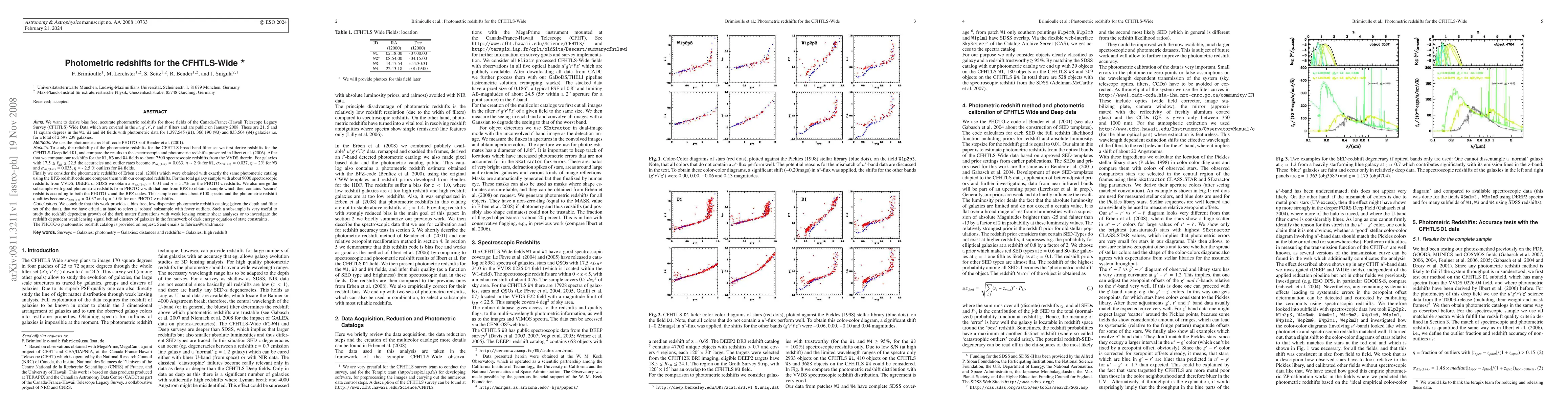 This paper derives accurate, bias-free photometric redshifts for 2.597 million galaxies in the CFHTLS-Wide survey using the PHOTO-z code, achieving accuracies of sigma=0.033-0.037 and outlier rates of ~1-2.5%. A merged subsample with 'secure' redshifts from both PHOTO-z and BPZ codes shows even better quality, with sigma=0.037 and 1.0% outliers, useful for dark energy studies.