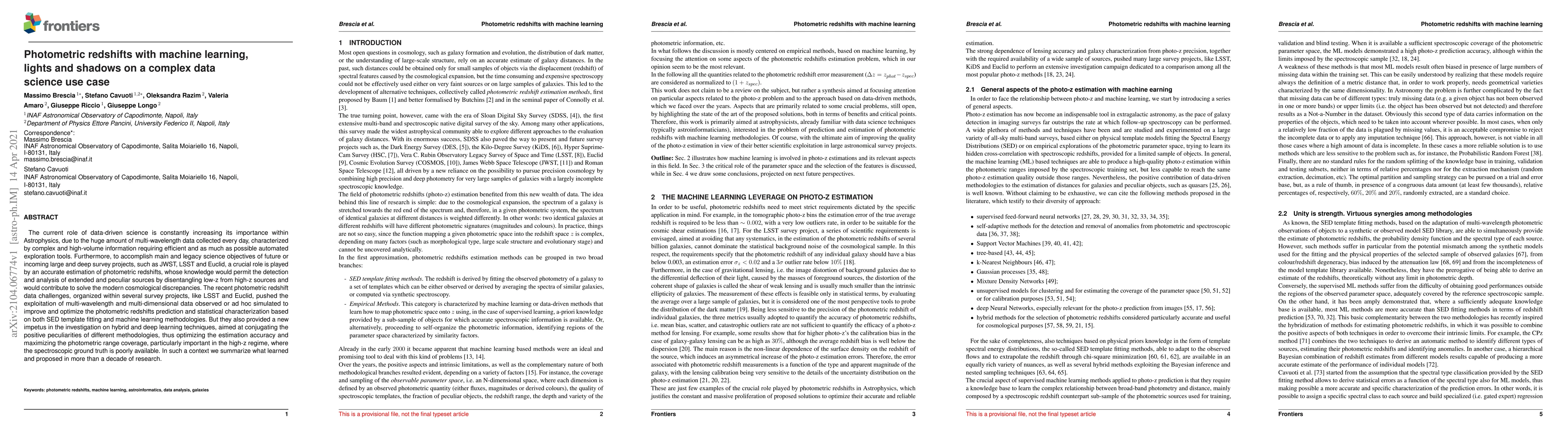 The current role of data-driven science is constantly increasing its importance within Astrophysics, due to the huge amount of multi-wavelength data collected every day, characterized by complex and high-volume information requiring efficient and as much as possible automated exploration tools. Furthermore, to accomplish main and legacy science objectives of future or incoming large and deep survey projects, such as JWST, LSST and Euclid, a crucial role is played by an accurate estimation of photometric redshifts, whose knowledge would permit the detection and analysis of extended and peculiar sources by disentangling low-z from high-z sources and would contribute to solve the modern cosmological discrepancies. The recent photometric redshift data challenges, organized within several survey projects, like LSST and Euclid, pushed the exploitation of multi-wavelength and multi-dimensional data observed or ad hoc simulated to improve and optimize the photometric redshifts prediction and statistical characterization based on both SED template fitting and machine learning methodologies. But they also provided a new impetus in the investigation on hybrid and deep learning techniques, aimed at conjugating the positive peculiarities of different methodologies, thus optimizing the estimation accuracy and maximizing the photometric range coverage, particularly important in the high-z regime, where the spectroscopic ground truth is poorly available. In such a context we summarize what learned and proposed in more than a decade of research.