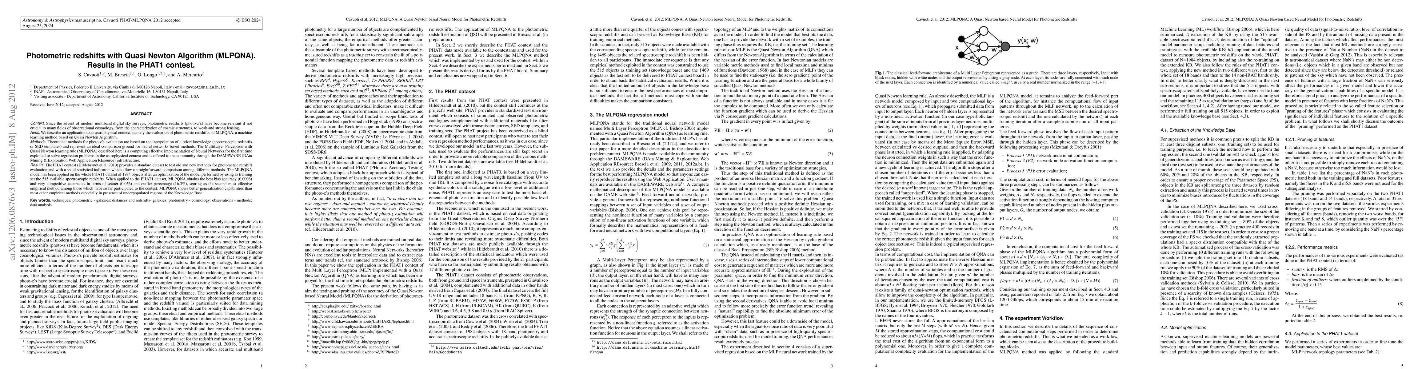 Context. Since the advent of modern multiband digital sky surveys, photometric redshifts (photo-z's) have become relevant if not crucial to many fields of observational cosmology, from the characterization of cosmic structures, to weak and strong lensing. Aims. We describe an application to an astrophysical context, namely the evaluation of photometric redshifts, of MLPQNA, a machine learning method based on Quasi Newton Algorithm. Methods. Theoretical methods for photo-z's evaluation are based on the interpolation of a priori knowledge (spectroscopic redshifts or SED templates) and represent an ideal comparison ground for neural networks based methods. The MultiLayer Perceptron with Quasi Newton learning rule (MLPQNA) described here is a computing effective implementation of Neural Networks for the first time exploited to solve regression problems in the astrophysical context and is offered to the community through the DAMEWARE (DAta Mining & ExplorationWeb Application REsource) infrastructure. Results. The PHAT contest (Hildebrandt et al. 2010) provides a standard dataset to test old and new methods for photometric redshift evaluation and with a set of statistical indicators which allow a straightforward comparison among different methods. The MLPQNA model has been applied on the whole PHAT1 dataset of 1984 objects after an optimization of the model performed by using as training set the 515 available spectroscopic redshifts. When applied to the PHAT1 dataset, MLPQNA obtains the best bias accuracy (0.0006) and very competitive accuracies in terms of scatter (0.056) and outlier percentage (16.3%), scoring as the second most effective empirical method among those which have so far participated to the contest. MLPQNA shows better generalization capabilities than most other empirical methods especially in presence of underpopulated regions of the Knowledge Base.