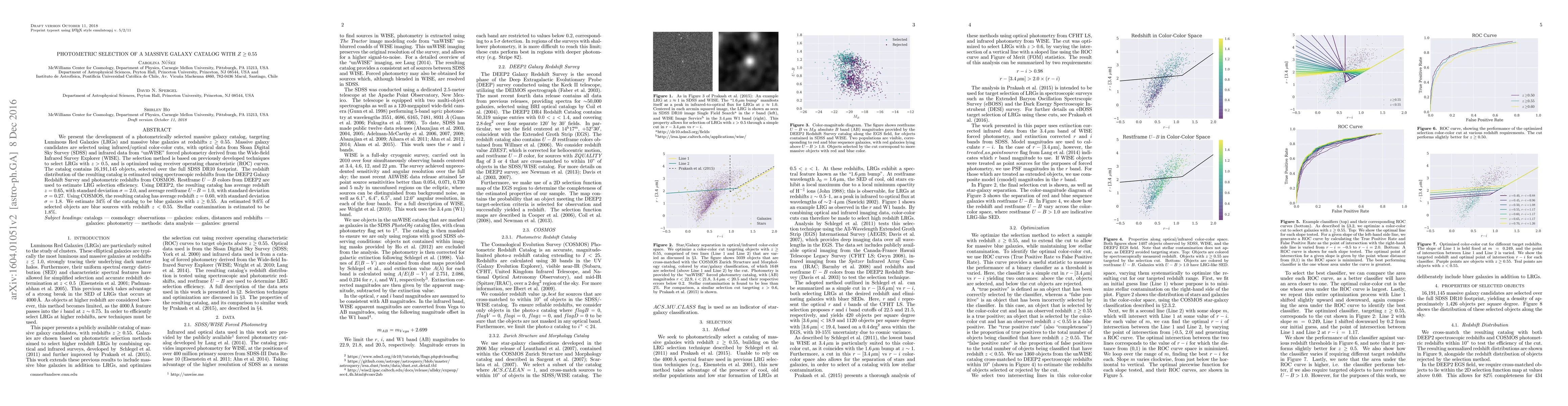 We present the development of a photometrically selected massive galaxy catalog, targeting Luminous Red Galaxies (LRGs) and massive blue galaxies at redshifts $z\geq 0.55$. Massive galaxy candidates are selected using infrared/optical color-color cuts, with optical data from Sloan Digital Sky Survey (SDSS) and infrared data from "unWISE" forced photometry derived from the Wide-field Infrared Survey Explorer (WISE). The selection method is based on previously developed techniques to select LRGs with $z>0.5$, and is optimized using receiver operating characteristic (ROC) curves. The catalog contains 16,191,145 objects, selected over the full SDSS DR10 footprint. The redshift distribution of the resulting catalog is estimated using spectroscopic redshifts from the DEEP2 Galaxy Redshift Survey and photometric redshifts from COSMOS. Restframe $U-B$ colors from DEEP2 are used to estimate LRG selection efficiency. Using DEEP2, the resulting catalog has average redshift $z=0.65$, with standard deviation $\sigma = 2.0$, and average restframe $U-B=1.0$, with standard deviation $\sigma=0.27$. Using COSMOS, the resulting catalog has average redshift $z=0.60$, with standard deviation $\sigma = 1.8$. We estimate 34% of the catalog to be blue galaxies with $z\geq0.55$. An estimated 9.6% of selected objects are blue sources with redshift $z<0.55$. Stellar contamination is estimated to be 1.8%.