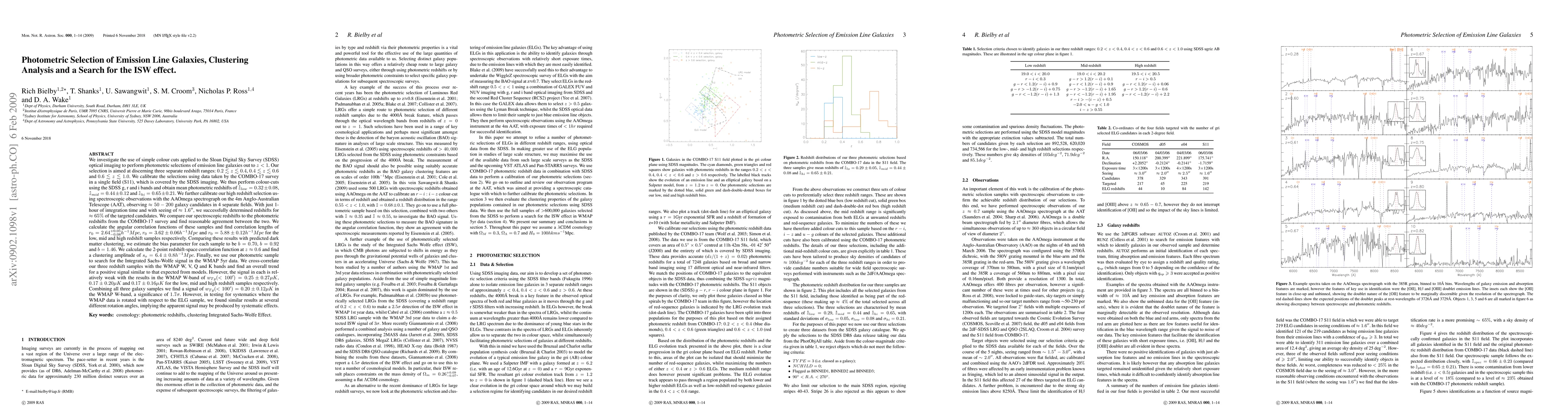 We investigate the use of simple colour cuts applied to the SDSS optical imaging to perform photometric selections of emission line galaxies out to z<1. From colour-cuts using the SDSS g, r and i bands, we obtain mean photometric redshifts of z=0.32+-0.08, z=0.44+-0.12 and z=0.65+-0.21. We further calibrate our high redshift selection using spectroscopic observations with the AAOmega spectrograph on the 4m Anglo-Australian Telescope (AAT), observing ~50-200 galaxy candidates in 4 separate fields. With just 1-hour of integration time and with seeing of ~1.6", we successfully determined redshifts for ~65% of the targeted candidates. We calculate the angular correlation functions of the samples and find correlation lengths of r0=2.64 h-1 Mpc, r0=3.62 h-1 Mpc and r0=5.88 h-1 Mpc for the low, mid and high redshift samples respectively. Comparing these results with predicted dark matter clustering, we estimate the bias parameter for each sample to be b=0.70, b=0.92 and b=1.46. We calculate the 2-point redshift-space correlation function at z~0.6 and find a clustering amplitude of s0=6.4 h-1 Mpc. Finally, we use our photometric sample to search for the Integrated Sachs-Wolfe signal in the WMAP 5yr data. We cross-correlate our three redshift samples with the WMAP W, V, Q and K bands and find an overall trend for a positive signal similar to that expected from models. However, the signal in each is relatively weak. Combining all three galaxy samples we find a signal of wTg(<100')=0.20+-0.12 microK in the WMAP W-band, a significance of 1.7sigma.