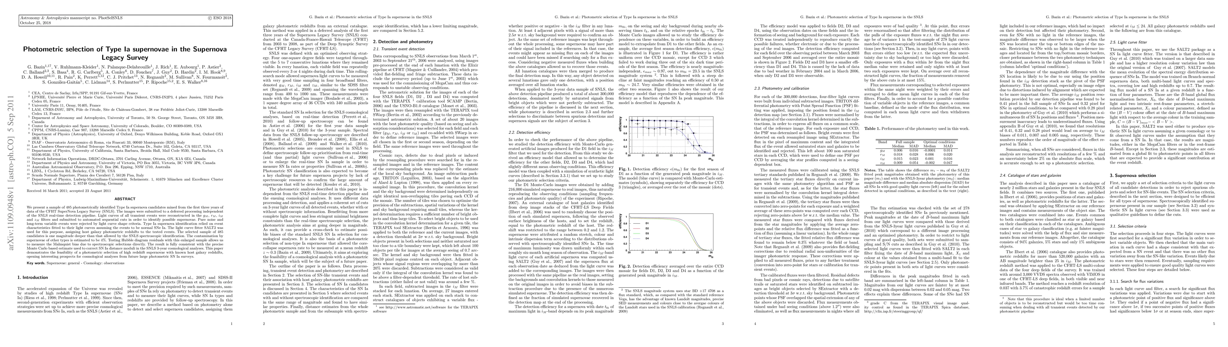 The paper presents a method to identify 485 photometric Type Ia supernova candidates from the first three years of the CFHT SuperNova Legacy Survey (SNLS) data, using the SALT2 light curve fitter. This sample is deeper than the spectroscopically identified SNe Ia, with an estimated 4% contamination from other supernova types. The approach validates the feasibility of photometric selection for high redshift SNe Ia, crucial for future large photometric surveys and cosmological analyses.