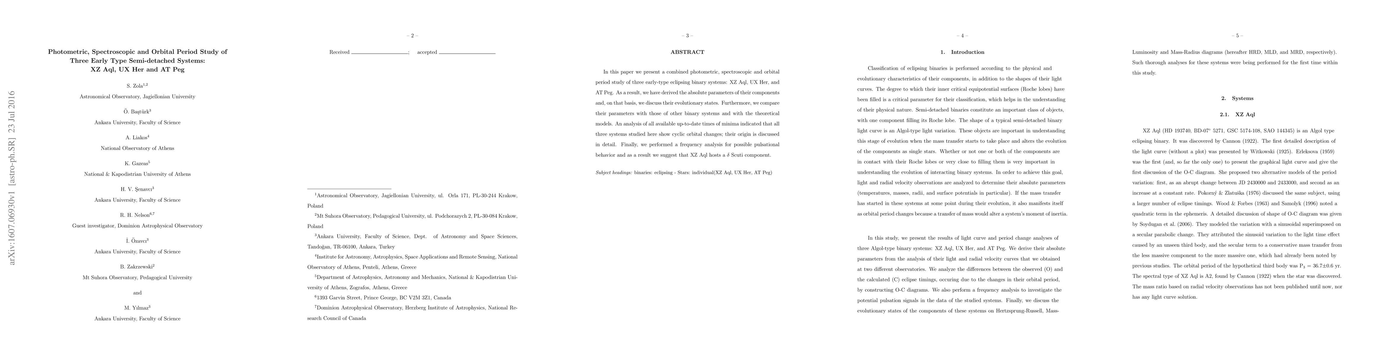 This paper combines photometric, spectroscopic, and orbital period studies of three early-type eclipsing binaries: XZ Aql, UX Her, and AT Peg, deriving their absolute parameters and discussing their evolutionary states. The study also reveals cyclic orbital changes in these systems and suggests XZ Aql may have a δ Scuti component.