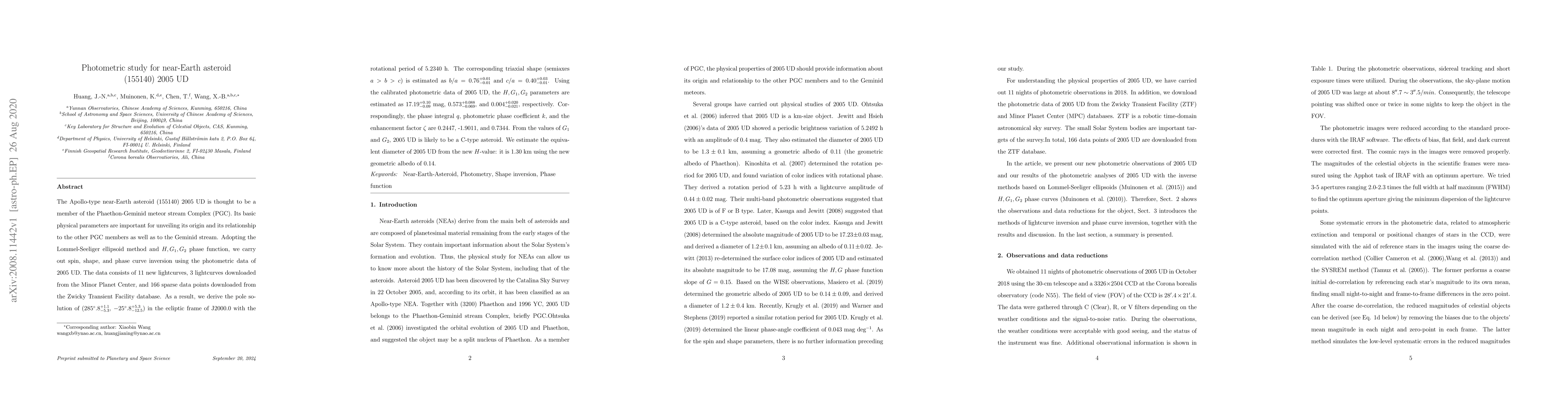 The study presents a comprehensive photometric analysis using the Lommel-Seeliger ellipsoid method and $H,G_1,G_2$ phase function to derive the spin, shape, and phase curve parameters of the near-Earth asteroid (155140) 2005 UD.