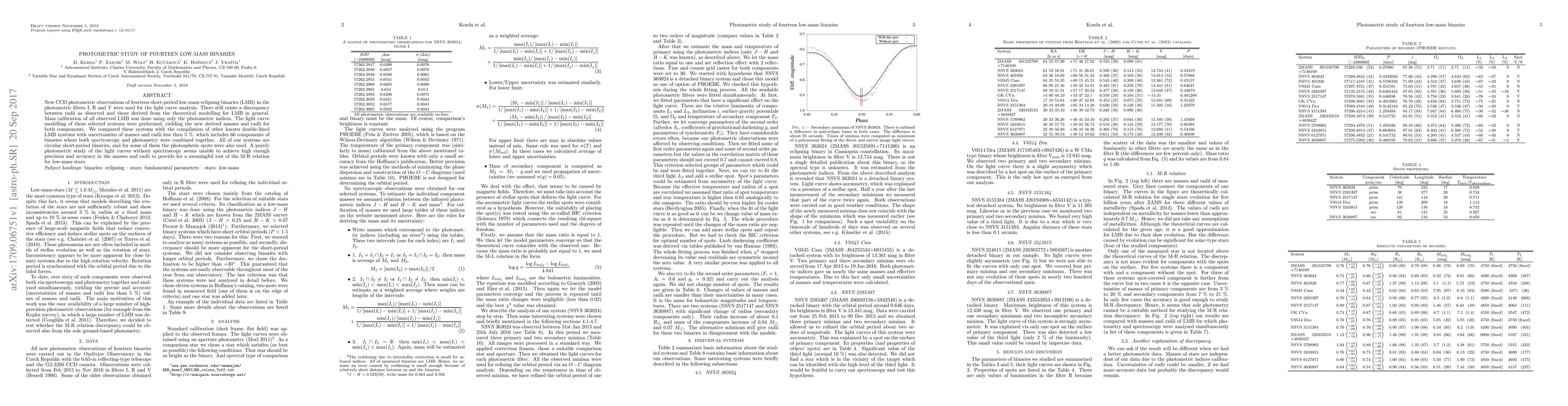 New CCD photometric observations of fourteen short-period low-mass eclipsing binaries (LMB) in the photometric filters I, R and V were used for the light curve analysis. There still exists a discrepancy between radii as observed and those derived from the theoretical modelling for LMB in general. Mass calibration of all observed LMB was done using only the photometric indices. The light curve modelling of these selected systems were performed, yielding the new derived masses and radii for both components. We compared these systems with the compilation of other known double-lined LMB systems with uncertainties of masses and radii less then 5 \%, which includes 66 components of binaries where both spectroscopy and photometry were combined together. All of our systems are circular short-period binaries, and for some of them the photospheric spots were also used. A purely photometric study of the light curves without spectroscopy seems unable to achieve high enough precision and accuracy in the masses and radii to provide for a meaningful test of the M-R relation for low-mass stars.
