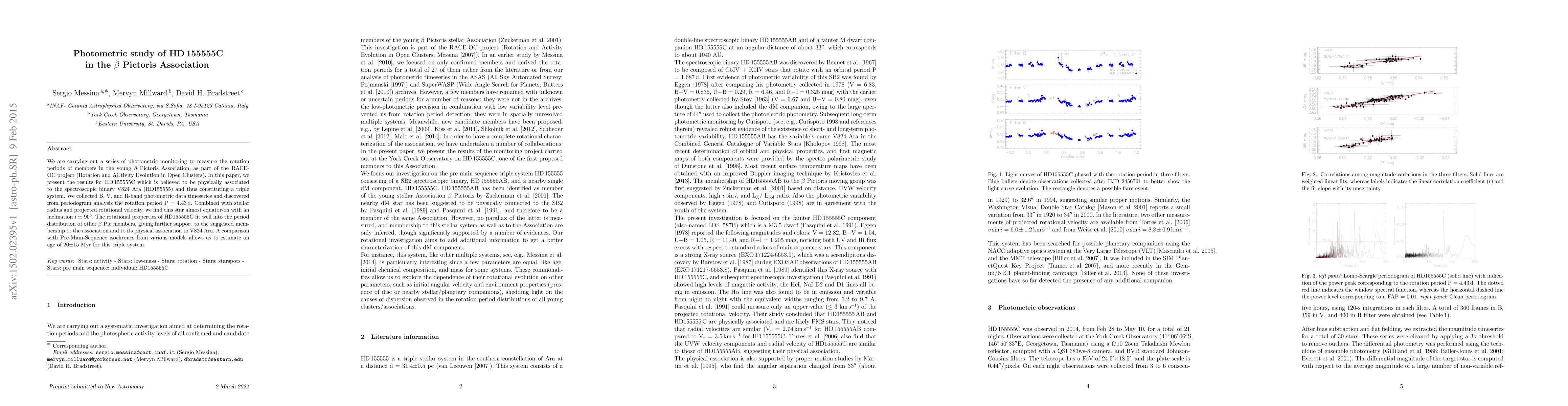 We are carrying out a series of photometric monitoring to measure the rotation periods of members in the young $\beta$ Pictoris Association, as part of the RACE-OC project (Rotation and ACtivity Evolution in Open Clusters). In this paper, we present the results for HD 155555C which is believed to be physically associated to the spectroscopic binary V824 Ara (HD155555) and thus constituting a triple system. We collected B, V, and R-band photometric data timeseries and discovered from periodogram analysis the rotation period P = 4.43d. Combined with stellar radius and projected rotational velocity, we find this star almost equator-on with an inclination $i$ $\simeq$ 90$^{\circ}$. The rotational properties of HD155555C fit well into the period distribution of other $\beta$ Pic members, giving further support to the suggested membership to the association and to its physical association to V824 Ara. A comparison with Pre-Main-Sequence isochrones from various models allows us to estimate an age of 20$\pm$15 Myr for this triple system.