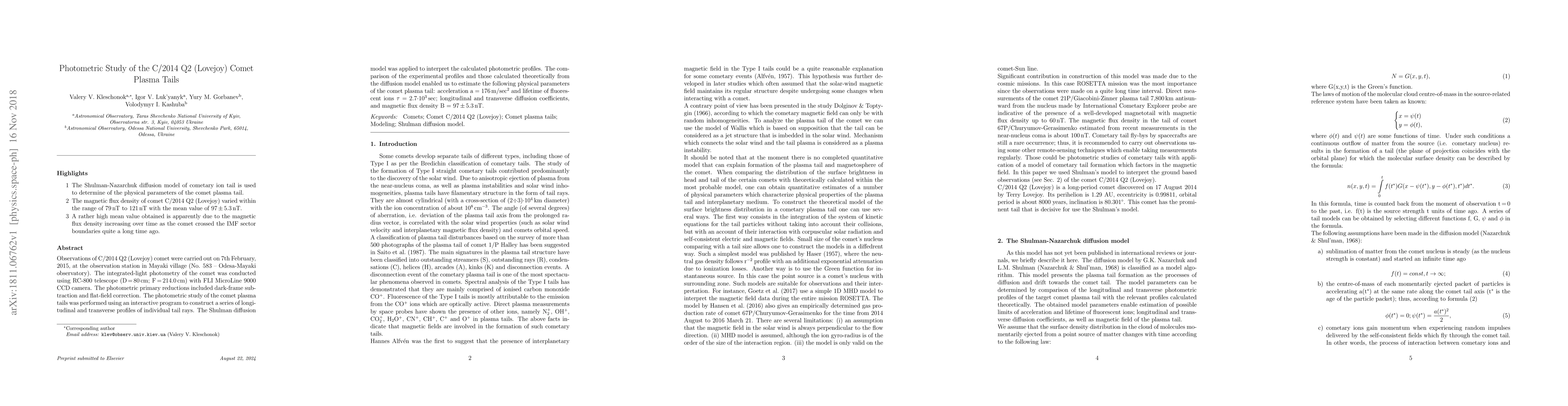 Observations of C/2014 Q2 (Lovejoy) comet were carried out on 7th February, 2015, at the observation station in Mayaki village (No. 583 -- Odesa-Mayaki observatory). The integrated-light photometry of the comet was conducted using RC-800 telescope (D = 80 cm; F = 214.0 cm) with FLI MicroLine 9000 CCD camera. The photometric primary reductions included dark-frame subtraction and flat-field correction. The photometric study of the comet plasma tails was performed using an interactive program to construct a series of longitudinal and transverse profiles of individual tail rays. The Shulman diffusion model was applied to interpret the calculated photometric profiles. The comparison of the experimental profiles and those calculated theoretically from the diffusion model enabled us to estimate the following physical parameters of the comet plasma tail: acceleration a = 176 m/sec$^2$ and lifetime of fluorescent ions $\tau$ = 2.7$\cdot$10$^3$ sec; longitudinal and transverse diffusion coefficients, and magnetic flux density B = 97 $\pm$ 5.3 nT.
