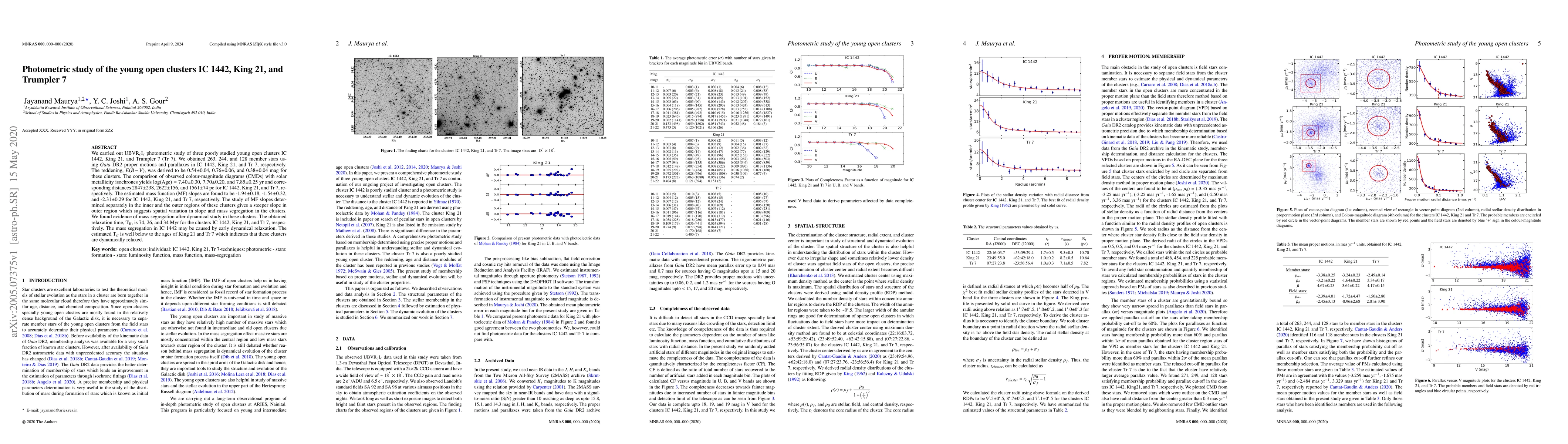 This study conducted UBVRcIc photometric analysis of three young open clusters—IC 1442, King 21, and Trumpler 7—using Gaia DR2 data, revealing ages of 7.40, 7.70, and 7.85 Myr, respectively, and distances of 2847, 2622, and 1561 pc. The research found evidence of mass segregation and spatial variation in mass function slopes, indicating dynamical relaxation in the clusters.