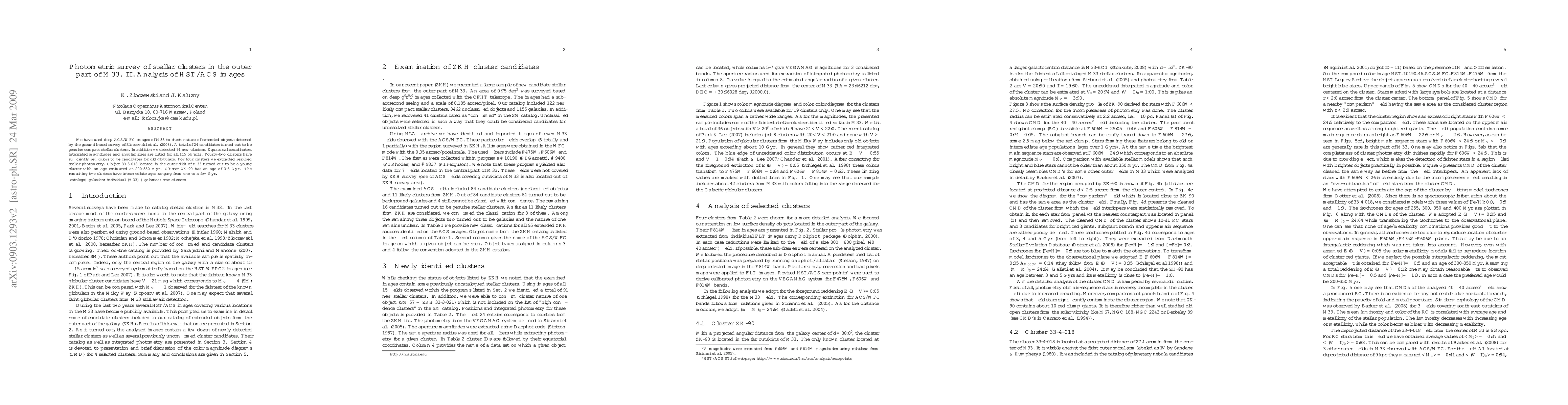 We have used deep ACS/WFC images of M33 to check nature of extended objects detected by the ground based survey of Zloczewski et al. (2008). A total of 24 candidates turned out to be genuine compact stellar clusters. In addition we detected 91 new clusters. Equatorial coordinates, integrated magnitudes and angular sizes are listed for all 115 objects. Fourty-two clusters have sufficiently red colors to be candidates for old globulars. For four clusters we extracted resolved stellar photometry. Object 33-3-018 located in the outer disk of M33 turned out to be a young cluster with an age estimated at 200-350 Myr. Cluster ZK-90 has an age of 3-5 Gyr. The remaining two clusters have intermediate ages ranging from one to a few Gyr.