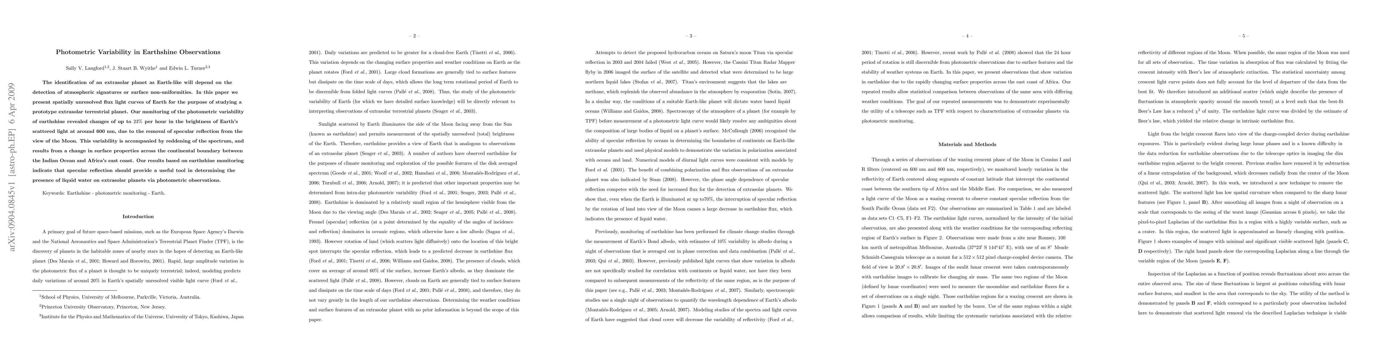 This paper investigates the photometric variability of Earth's scattered light, or "earthshine," to study potential atmospheric signatures of Earth-like extrasolar planets. The study finds significant brightness changes and spectral reddening due to surface property variations, suggesting specular reflection could help detect liquid water on other planets.