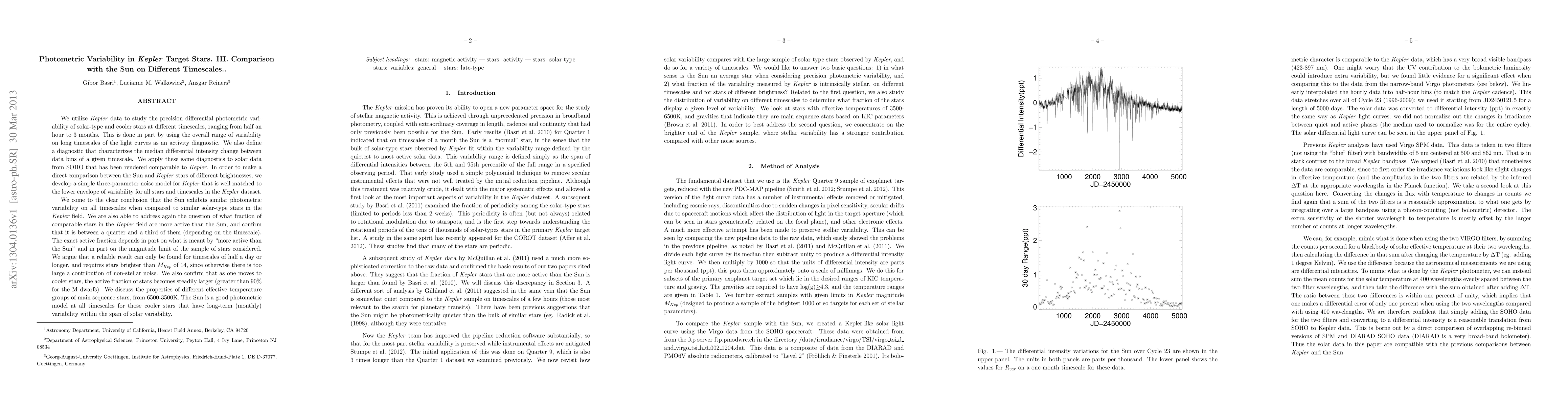 We utilize Kepler data to study the precision differential photometric variability of solar-type and cooler stars at different timescales, ranging from half an hour to 3 months. We define a diagnostic that characterizes the median differential intensity change between data bins of a given timescale. We apply the same diagnostics to SOHO data that has been rendered comparable to Kepler. The Sun exhibits similar photometric variability on all timescales as comparable solar-type stars in the Kepler field (it is not unusually quiet). The previously-defined photometric "range" serves as our activity proxy (driven by starspot coverage). We revisit the fraction of comparable stars in the Kepler field that are more active than the Sun. The exact active fraction depends on what is meant by "more active than the Sun", and on the magnitude limit of the sample of stars considered. This active fraction is between a quarter and a third (depending on the timescale). We argue that a reliable result requires timescales of half a day or longer and stars brighter than Kepler magnitude of 14, otherwise non-stellar noise distorts it. We also analyze main sequence stars grouped by temperature from 6500-3500K. As one moves to cooler stars, the active fraction of stars becomes steadily larger (greater than 90% for early M dwarfs). The Sun is a good photometric model at all timescales for those cooler stars that have long-term variability within the span of solar variability.