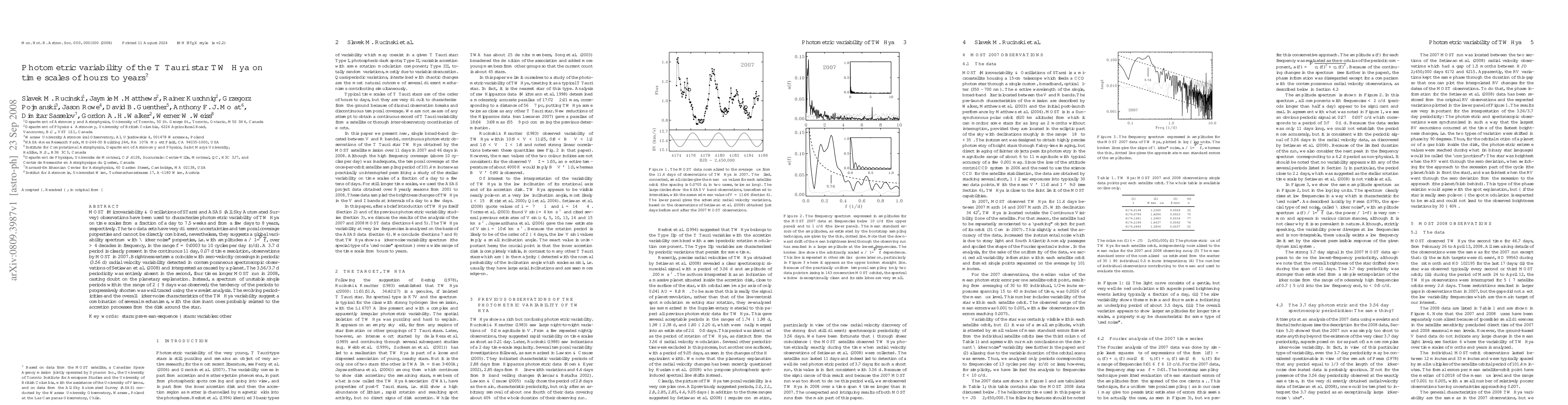MOST (Microvariability & Oscillations of STars) and ASAS (All Sky Automated Survey) observations have been used to characterize photometric variability of TW Hya on time scales from a fraction of a day to 7.5 weeks and from a few days to 8 years, respectively. The two data sets have very different uncertainties and temporal coverage properties and cannot be directly combined, nevertheless, they suggests a global variability spectrum with "flicker noise" properties, i.e. with amplitudes a ~ 1/sqrt(f), over >4 decades in frequency, in the range f = 0.0003 to 10 cycles per day (c/d). A 3.7 d period is clearly present in the continuous 11 day, 0.07 d time resolution, observations by MOST in 2007. Brightness extrema coincide with zero-velocity crossings in periodic (3.56 d) radial velocity variability detected in contemporaneous spectroscopic observations of Setiawan et al. (2008) and interpreted as caused by a planet. The 3.56/3.7 d periodicity was entirely absent in the second, four times longer MOST run in 2008, casting doubt on the planetary explanation. Instead, a spectrum of unstable single periods within the range of 2 - 9 days was observed; the tendency of the periods to progressively shorten was well traced using the wavelet analysis. The evolving periodicities and the overall flicker-noise characteristics of the TW Hya variability suggest a combination of several mechanisms, with the dominant ones probably related to the accretion processes from the disk around the star.