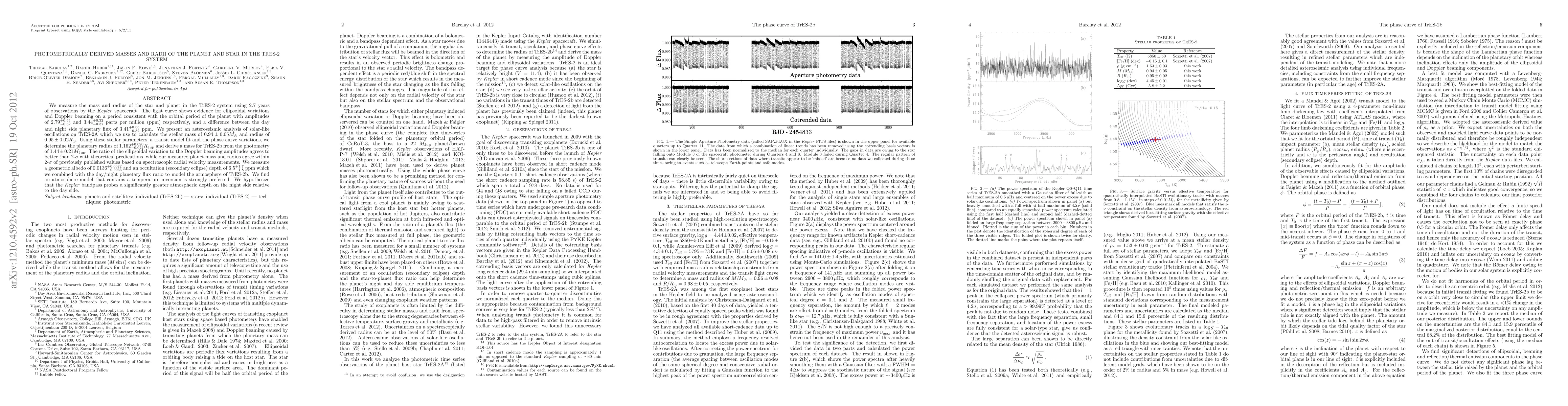 We measure the mass and radius of the star and planet in the TrES-2 system using 2.7 years of observations by the Kepler spacecraft. The light curve shows evidence for ellipsoidal variations and Doppler beaming on a period consistent with the orbital period of the planet with amplitudes of 2.79+0.44-0.62 and 3.44+0.32-0.37 parts per million (ppm) respectively, and a difference between the day and night side planetary flux of 3.41+0.55-0.82 ppm. We present an asteroseismic analysis of solar-like oscillations on TrES-2A which we use to calculate the stellar mass of 0.94+/-0.05 MSun and radius of 0.95+/-0.02 RSun. Using these stellar parameters, a transit model fit and the phase curve variations, we determine the planetary radius of 1.162+0.020-0.024 RJup and derive a mass for TrES-2b from the photometry of 1.44+/-0.21 MJup. The ratio of the ellipsoidal variation to the Doppler beaming amplitudes agrees to better than 2{\sigma} with theoretical predications, while our measured planet mass and radius agree within 2-{\sigma} of previously published values based on spectroscopic radial velocity measurements. We measure a geometric albedo of 0.0136+0.0022-0.0033 and an occultation (secondary eclipse) depth of 6.5+1.7-1.8 ppm which we combined with the day/night planetary flux ratio to model the atmosphere of TReS-2b. We find an atmosphere model that contains a temperature inversion is strongly preferred. We hypothesize that the Kepler bandpass probes a significantly greater atmospheric depth on the night side relative to the day side.