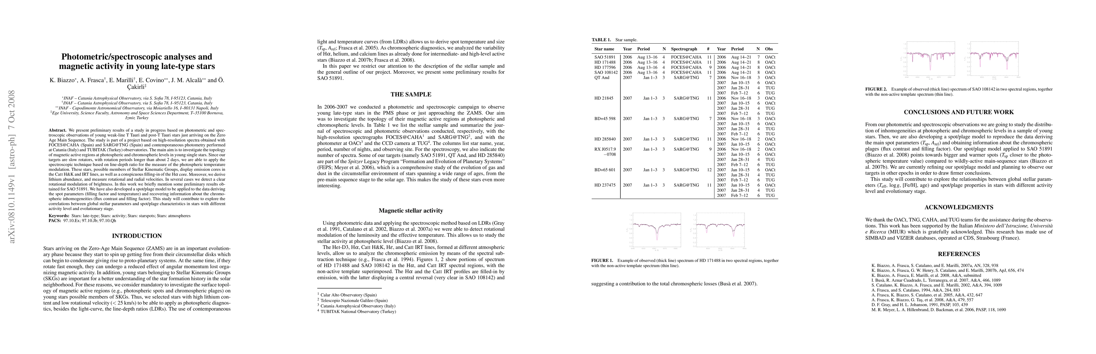 We present the work in progress of a study based on photometric and spectroscopic observations of young Weak-line T Tauri and Post T Tauri stars just attiving on the Zero Age Main Sequence. This study is part of a project based on high-resolution spectra obtained with FOCES@CAHA (Spain) and SARG@TNG (Spain) and contemporaneous photometry performed at Catania (Italy) and Ege (Turkey) observatories. The main aim is to investigate the topology of magnetic active regions at photospheric and chromospheric levels in young single stars. Since our targets are slow rotators (vsini < 25 km/s), corresponding to rotation periods larger than about 2 days, we are able to apply the spectroscopic technique based on line-depth ratio for the measure of the photospheric temperature modulation. These stars, possible members of Stellar Kinematic Groups, display emission cores in the CaII H&K and IRT lines, as well as a conspicuous filling-in of the Halpha core. Moreover, we detect absorption of the HeI-D3 line, coming from the upper chromospheric layers, derive the lithium abundance (age indicator), and measure the rotational and radial velocities. We find a clear rotational modulation, due to photospheric spots, both in the light and the temperature curves. The Halpha and the CaII-IRT emissions display a fair variation correlated with the rotation. Finally, we are developing a spot/plage model to reproduce the data and derive the spot parameters (namely, filling factor and temperature) and to recover information about the chromospheric inhomogeneities (flux contrast and filling factor). This study is very important to explore the correlations between global stellar parameters (e.g., surface gravity, effective temperature) and spot/plage characteristics in stars with different activity level and evolutionary stage.