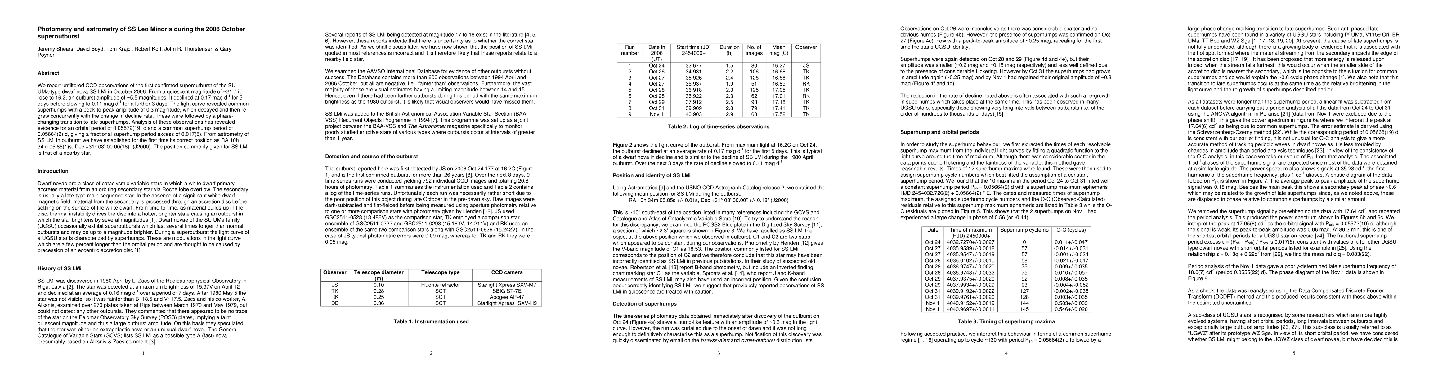 We report unfiltered CCD observations of the first confirmed superoutburst of the SU UMa-type dwarf nova SS LMi in October 2006. From a quiescent magnitude of around 21.7 it rose to 16.2, an outburst amplitude of about 5.5 magnitudes. It declined at 0.17 mag/d for 5 days before slowing to 0.11 mag/d for a further 3 days. The light curve revealed common superhumps with a peak-to-peak amplitude of 0.3 magnitude, which decayed and then re-grew concurrently with the change in decline rate. These were followed by a phase-changing transition to late superhumps. Analysis of these observations has revealed evidence for an orbital period of 0.05572(19) d and a common superhump period of 0.05664(2) d, giving a fractional superhump period excess of 0.017(5). From astrometry of SS LMi in outburst we have established for the first time its correct position as RA 10h 34m 05.85(1)s, Dec +31deg 08m 00.00(18)s (J2000). The position commonly given for SS LMi is that of a nearby star.