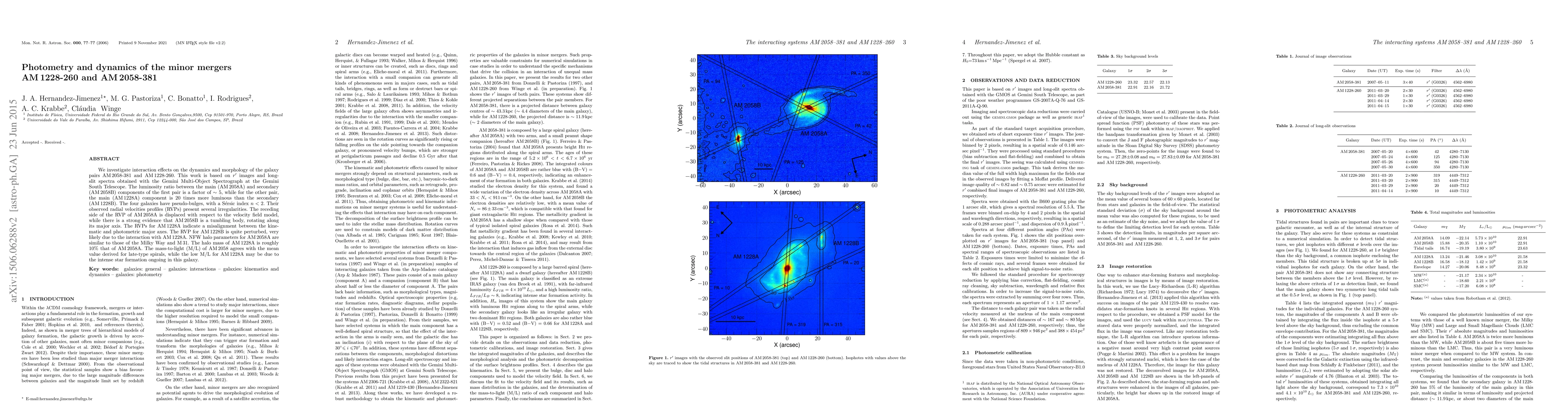 We investigate interaction effects on the dynamics and morphology of the galaxy pairs AM\,2058-381 and AM\,1228-260. This work is based on $r'$ images and long-slit spectra obtained with the Gemini Multi-Object Spectrograph at the Gemini South Telescope. The luminosity ratio between the main (AM\,2058A) and secondary (AM\,2058B) components of the first pair is a factor of $\sim$ 5, while for the other pair, the main (AM\,1228A) component is 20 times more luminous than the secondary (AM\,1228B). The four galaxies have pseudo-bulges, with a S\'ersic index $n<2$. Their observed radial velocities profiles (RVPs) present several irregularities. The receding side of the RVP of AM\,2058A is displaced with respect to the velocity field model, while there is a strong evidence that AM\,2058B is a tumbling body, rotating along its major axis. The RVPs for AM\,1228A indicate a misalignment between the kinematic and photometric major axes. The RVP for AM\,1228B is quite perturbed, very likely due to the interaction with AM\,1228A. NFW halo parameters for AM\,2058A are similar to those of the Milky Way and M\,31. The halo mass of AM\,1228A is roughly 10\% that of AM\,2058A. The mass-to-light (M/L) of AM\,2058 agrees with the mean value derived for late-type spirals, while the low M/L for AM\,1228A may be due to the intense star formation ongoing in this galaxy.