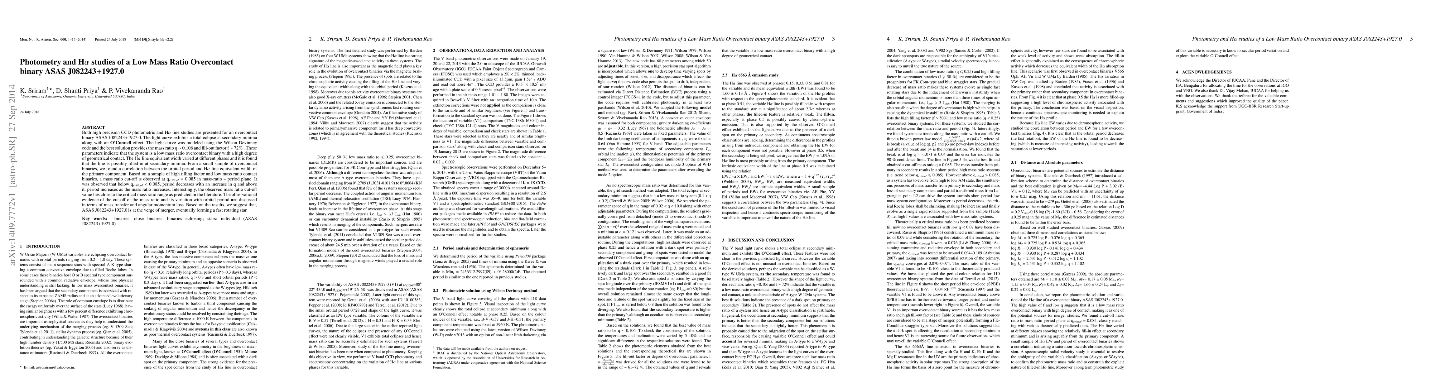 This paper presents high precision CCD photometric and H$alpha$ line studies of the low mass ratio overcontact binary ASAS J082243+1927.0, revealing a total eclipse and a correlation between orbital period and H$alpha$ line equivalent width, suggesting a mass ratio cut-off at q = 0.085 indicative of impending merger and fast rotating star formation.