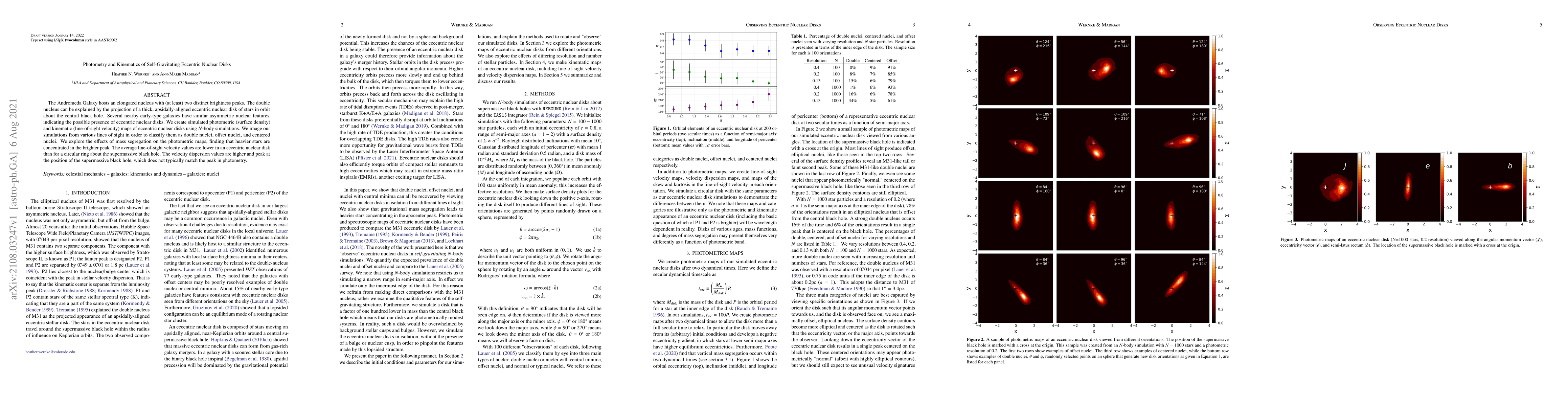 The Andromeda Galaxy hosts an elongated nucleus with (at least) two distinct brightness peaks. The double nucleus can be explained by the projection of a thick, apsidally-aligned eccentric nuclear disk of stars in orbit about the central black hole. Several nearby early-type galaxies have similar asymmetric nuclear features, indicating the possible presence of eccentric nuclear disks. We create simulated photometric (surface density) and kinematic (line-of-sight velocity) maps of eccentric nuclear disks using N-body simulations. We image our simulations from various lines of sight in order to classify them as double nuclei, offset nuclei, and centered nuclei. We explore the effects of mass segregation on the photometric maps, finding that heavier stars are concentrated in the brighter peak. The average line-of-sight velocity values are lower in an eccentric nuclear disk than for a circular ring about the supermassive black hole. The velocity dispersion values are higher and peak at the position of the supermassive black hole, which does not typically match the peak in photometry.