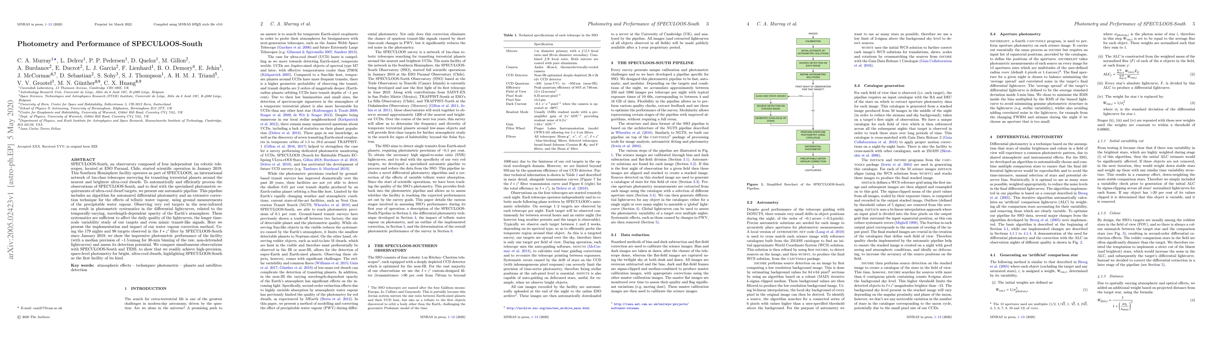 SPECULOOS-South, a network of four 1m robotic telescopes in Chile, began operations in 2019 to survey ultra-cool dwarfs for transiting terrestrial planets. The observatory's automatic pipeline corrects for atmospheric effects, achieving high-precision photometry with a median precision of ~1.5 mmag.