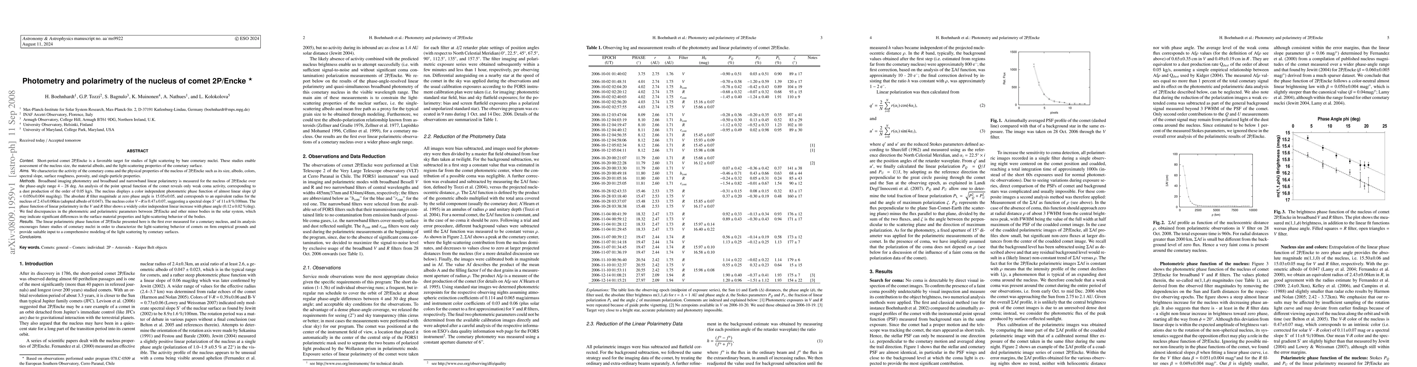Broadband imaging photometry, and broadband and narrowband linear polarimetry was measured for the nucleus of 2P/Encke over the phase-angle range 4 - 28 deg. An analysis of the point spread function of the comet reveals only weak coma activity, corresponding to a dust production of the order of 0.05 kg/s. The nucleus displays a color independent photometric phase function of almost linear slope. The absolute R filter magnitude at zero phase angle is 15.05 +/- 0.05, and corresponds to an equivalent radius for the nucleus of 2.43 +/- 0.06 km (for an adopted albedo of 0.047). The nucleus color V - R is 0.47 +/- 0.07, suggesting a spectral slope of 11 +/- 8 %/100nm. The phase function of linear polarimetry in the V and R filters shows a widely color independent linear increase with phase angle (0.12 +/- 0.02%/deg). We find discrepancies in the photometric and polarimetric parameters between 2P/Encke and other minor bodies in the solar system, which may indicate significant differences in the surface material properties and light-scattering behavior of the bodies. The linear polarimetric phase function of 2P/Encke presented here is the first ever measured for a cometary nucleus, and its analysis encourages future studies of cometary nuclei in order to characterize the light-scattering behavior of comets on firm empirical grounds and provide suitable input to a comprehensive modeling of the light scattering by cometary surfaces.