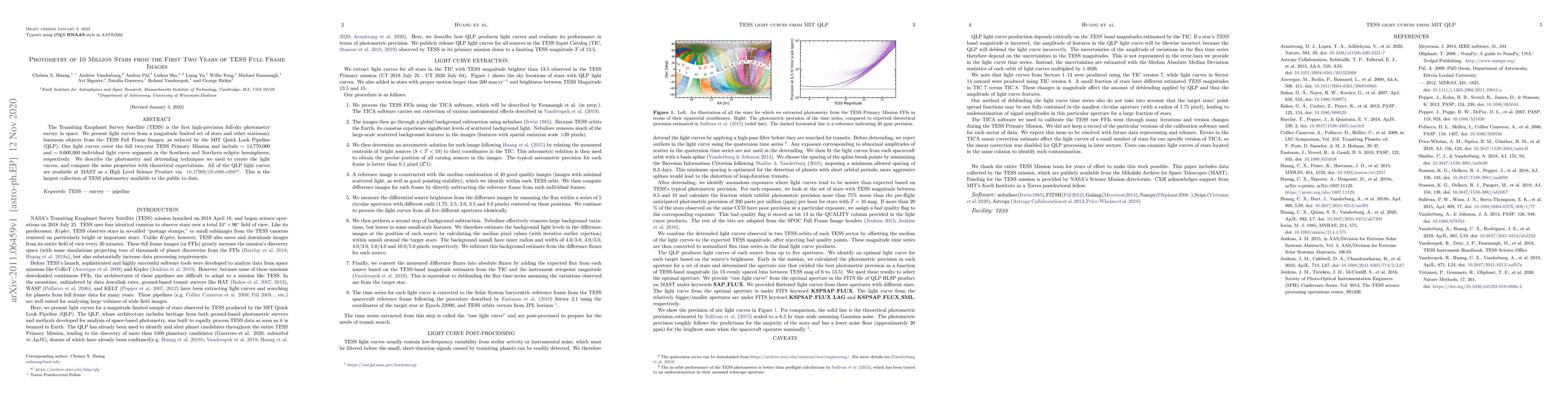 This paper presents light curves from the first two years of TESS Full Frame Images, covering approximately 10 million stars, generated by the MIT Quick Look Pipeline. The study details the photometry and detrending techniques used, and compares the noise properties with theoretical expectations, making the data publicly available for further research.