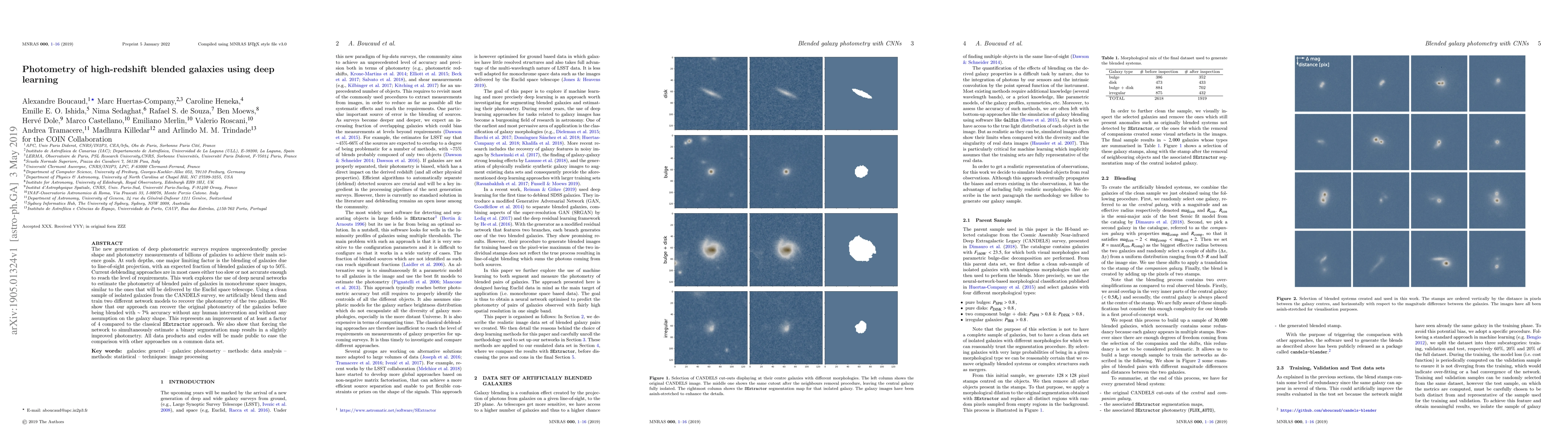 The new generation of deep photometric surveys requires unprecedentedly precise shape and photometry measurements of billions of galaxies to achieve their main science goals. At such depths, one major limiting factor is the blending of galaxies due to line-of-sight projection, with an expected fraction of blended galaxies of up to 50%. Current deblending approaches are in most cases either too slow or not accurate enough to reach the level of requirements. This work explores the use of deep neural networks to estimate the photometry of blended pairs of galaxies in monochrome space images, similar to the ones that will be delivered by the Euclid space telescope. Using a clean sample of isolated galaxies from the CANDELS survey, we artificially blend them and train two different network models to recover the photometry of the two galaxies. We show that our approach can recover the original photometry of the galaxies before being blended with $\sim$7% accuracy without any human intervention and without any assumption on the galaxy shape. This represents an improvement of at least a factor of 4 compared to the classical SExtractor approach. We also show that forcing the network to simultaneously estimate a binary segmentation map results in a slightly improved photometry. All data products and codes will be made public to ease the comparison with other approaches on a common data set.