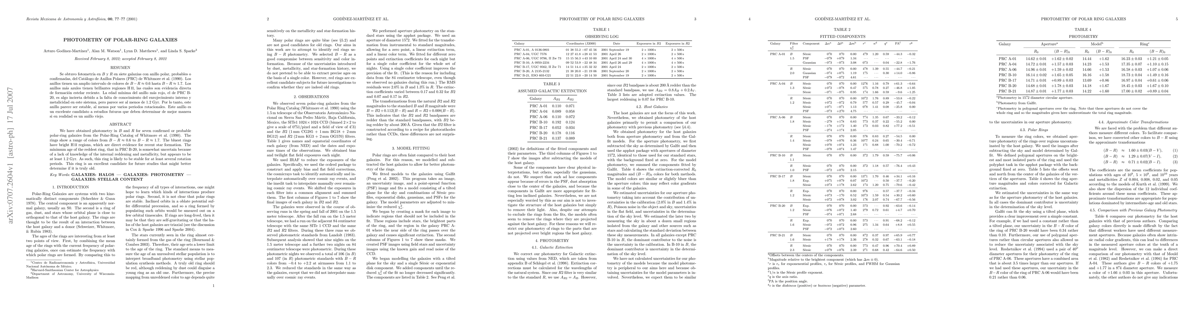 We have obtained photometry in B and R for seven confirmed or probable polar-ring galaxies from the Polar-Ring Catalog of Whitmore et al. (1990). The rings show a range of colors from B-R \approx 0.6 to B-R \approx 1.7. The bluest rings have bright HII regions, which are direct evidence for recent star formation. The minimum age of the reddest ring, that in PRC B-20, is somewhat uncertain because of a lack of knowledge of the internal reddening and metallicity, but appears to be at least 1.2 Gyr. As such, this ring is likely to be stable for at least several rotation periods. This ring is an excellent candidate for future studies that might better determine if it is truly old.