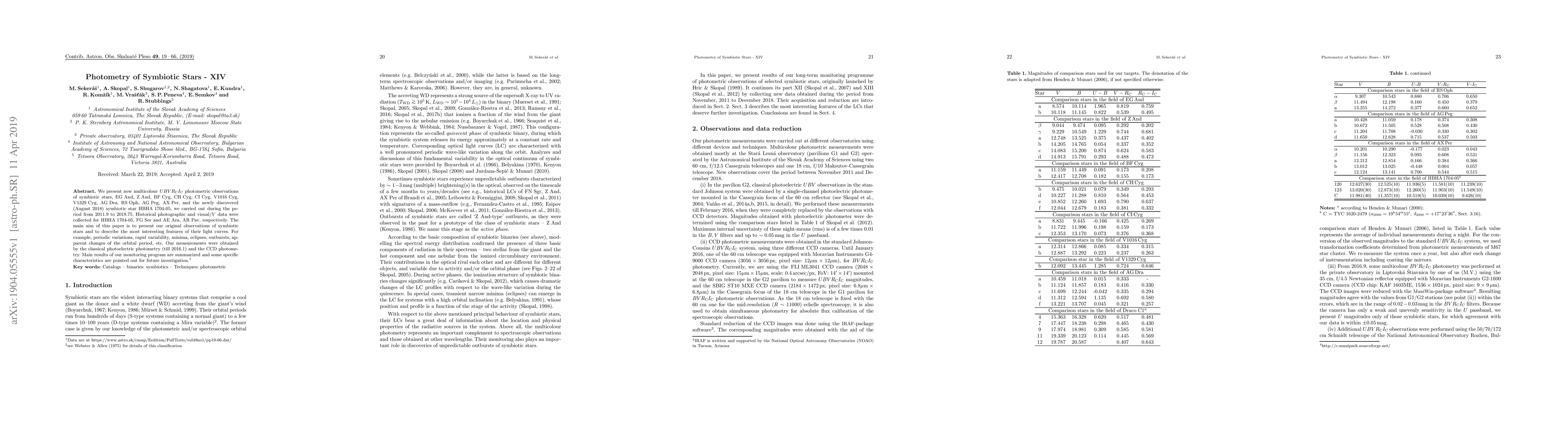 We present new multicolour UBVRcIc photometric observations of symbiotic stars, EG And, Z And, BF Cyg, CH Cyg, CI Cyg, V1016 Cyg, V1329 Cyg, AG Dra, RS Oph, AG Peg, AX Per, and the newly discovered (August 2018) symbiotic star HBHA 1704-05, we carried out during the period from 2011.9 to 2018.75. Historical photographic and visual/V data were collected for HBHA 1704-05, FG Ser and AE Ara, AR Pav, respectively. The main aim of this paper is to present our original observations of symbiotic stars and to describe the most interesting features of their light curves. For example, periodic variations, rapid variability, minima, eclipses, outbursts, apparent changes of the orbital period, etc. Our measurements were obtained by the classical photoelectric photometry (till 2016.1) and the CCD photometry. Main results of our monitoring program are summarized and some specific characteristics are pointed out for future investigation.