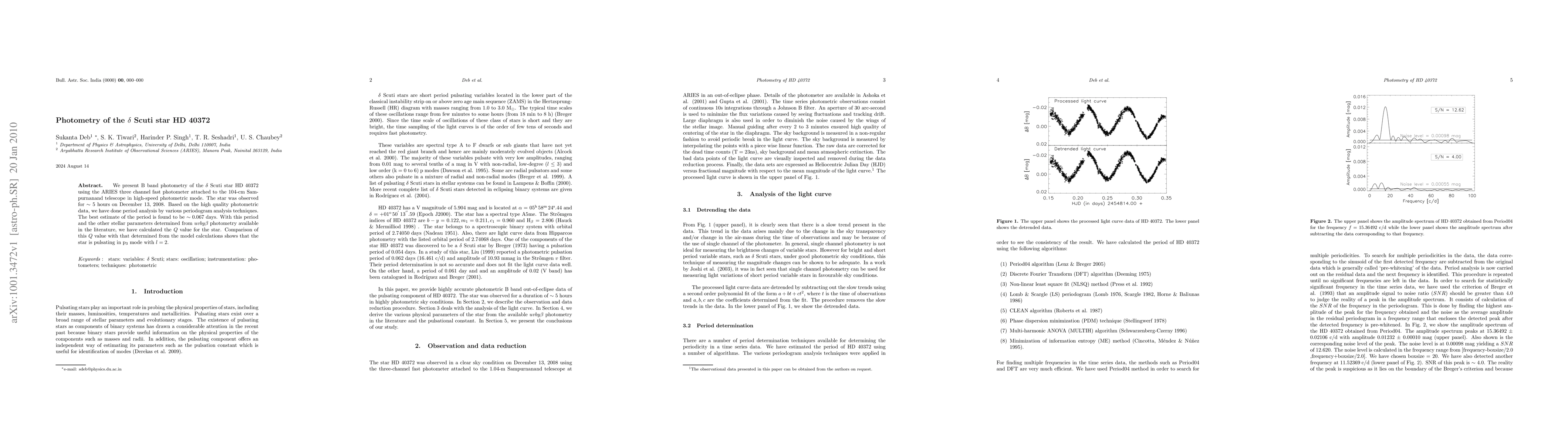 We present B band photometry of the $\delta$ Scuti star HD 40372 using the ARIES three channel fast photometer attached to the 104-cm Sampurnanand telescope in high-speed photometric mode. The star was observed for $\sim$ 5 hours on December 13, 2008. Based on the high quality photometric data, we have done period analysis by various periodogram analysis techniques. The best estimate of the period is found to be $\sim 0.067$ days. With this period and the other stellar parameters determined from $uvby\beta$ photometry available in the literature, we have calculated the $Q$ value for the star. Comparison of this $Q$ value with that determined from the model calculations shows that the star is pulsating in p$_{3}$ mode with $l = 2$.