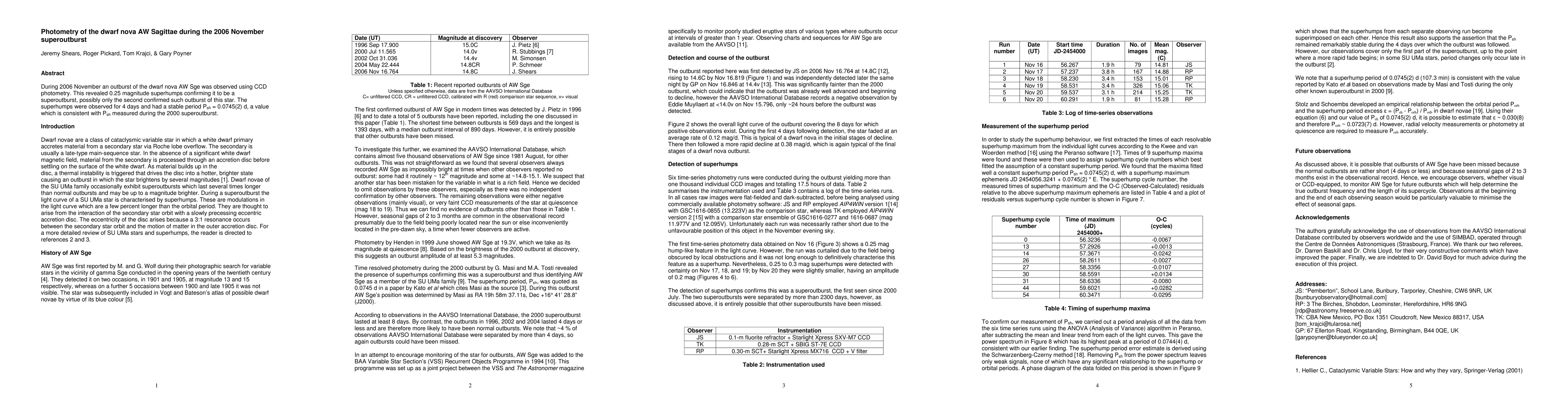 This study used CCD photometry to observe the 2006 November superoutburst of the dwarf nova AW Sagittae, confirming it with 0.25 magnitude superhumps, possibly the second such confirmed event. The stable superhump period of Psh = 0.0745(2)d was consistent with the 2000 superoutburst.