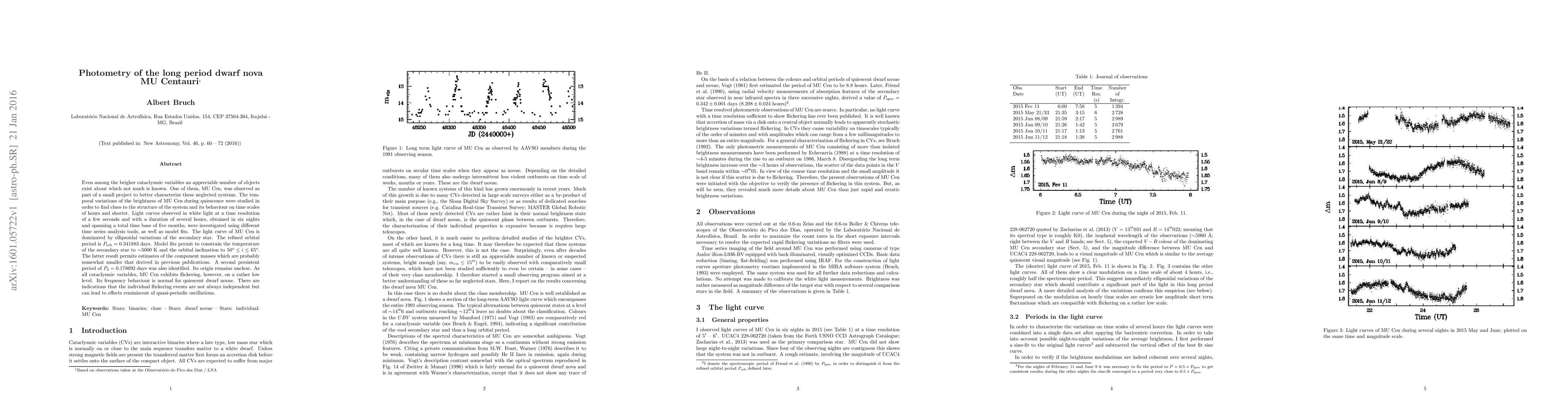 Researchers studied MU Centauri, a long period dwarf nova, using light curves with high time resolution to understand its structure and behavior. They found clues about the system's mass, temperature, and orbital inclination, as well as a persistent second period of flickering.