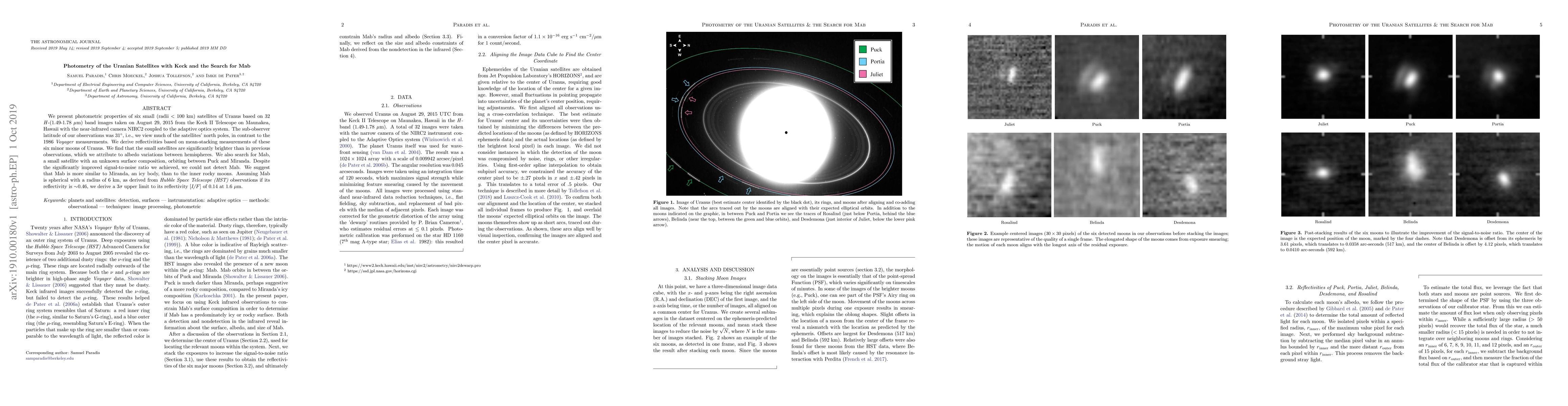 We present photometric properties of six small (radii < 100 km) satellites of Uranus based on 32 H-(1.49-1.78 um) band images taken on August 29, 2015 from the Keck II Telescope on Maunakea, Hawaii with the near-infrared camera NIRC2 coupled to the adaptive optics system. The sub-observer latitude of our observations was 31 deg, i.e., we view much of the satellites' north poles, in contrast to the 1986 Voyager measurements. We derive reflectivities based on mean-stacking measurements of these six minor moons of Uranus. We find that the small satellites are significantly brighter than in previous observations, which we attribute to albedo variations between hemispheres. We also search for Mab, a small satellite with an unknown surface composition, orbiting between Puck and Miranda. Despite the significantly improved signal-to-noise ratio we achieved, we could not detect Mab. We suggest that Mab is more similar to Miranda, an icy body, than to the inner rocky moons. Assuming Mab is spherical with a radius of 6 km, as derived from Hubble Space Telescope (HST) observations if its reflectivity is ~0.46, we derive a 3{\sigma} upper limit to its reflectivity of 0.14 [I/F] at 1.6 um.