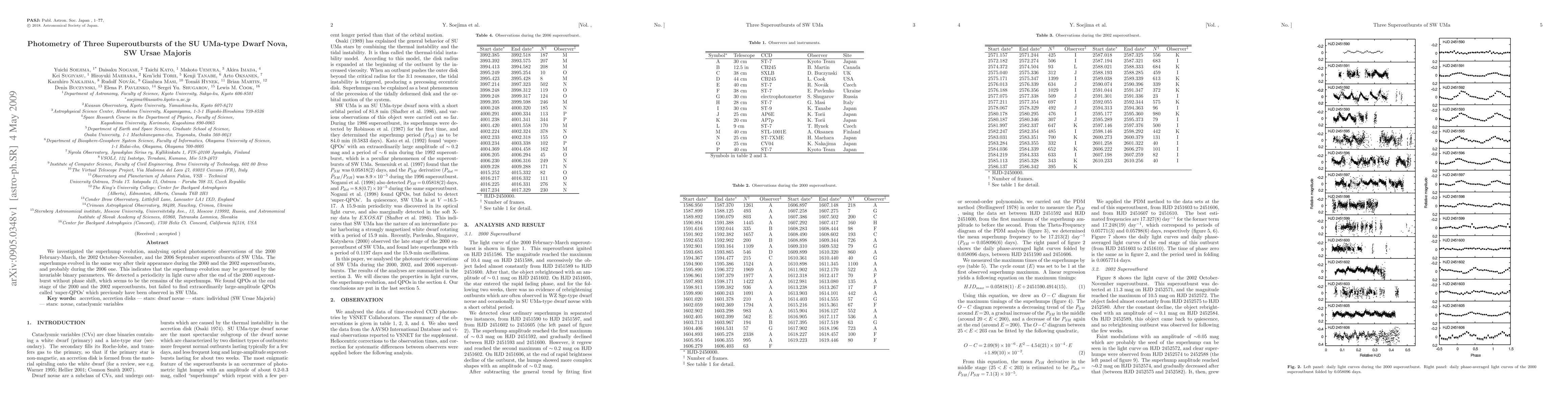 Researchers analyzed optical photometric observations of three superoutbursts in SW UMa, a dwarf nova, finding that the superhumps' evolution is likely governed by binary parameters, with no new 'super-QPOs' detected.