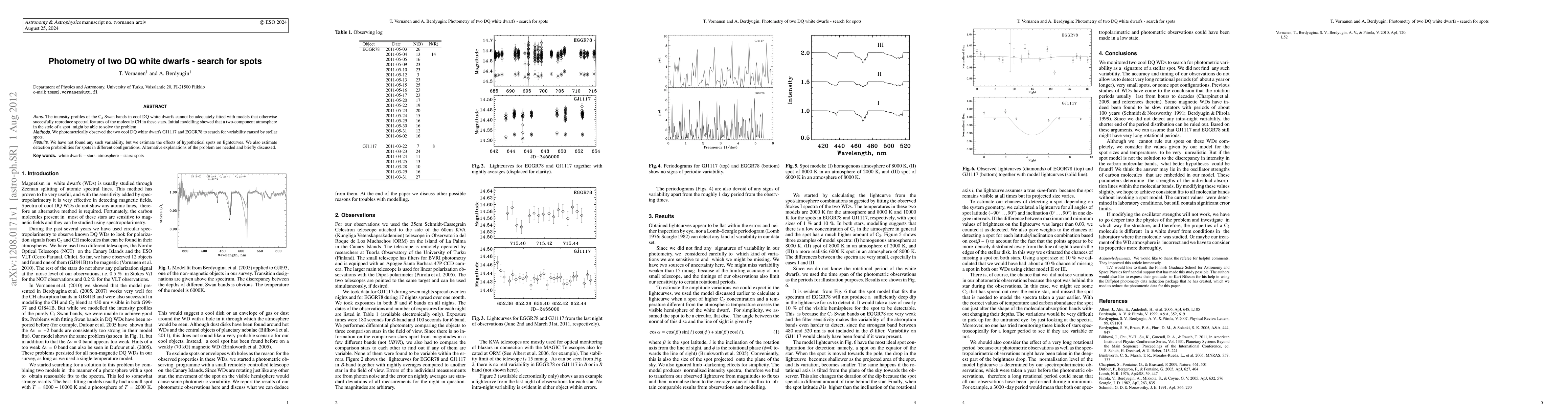 The paper investigates photometric observations of two DQ white dwarfs, GJ1117 and EGGR78, to search for variability indicative of stellar spots, but finds no such variability. The study suggests alternative explanations for the observed spectral discrepancies.