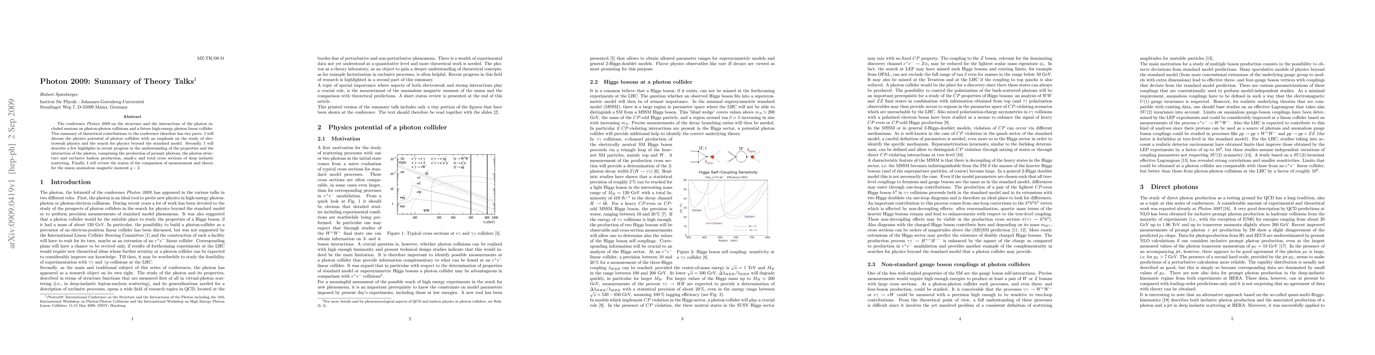 The conference 'Photon 2009' on the structure and the interactions of the photon included sessions on photon-photon collisions and a future high-energy photon linear collider. This summary of theoretical contributions to the conference therefore has two parts. I will discuss the physics potential of photon colliders with an emphasis on the study of electroweak physics and the search for physics beyond the standard model. Secondly, I will describe a few highlights in recent progress in the understanding of the properties and the interaction of the photon, comprising the production of prompt photons, the photon structure and exclusive hadron production, small-x and total cross sections of deep inelastic scattering. Finally, I will review the status of the comparison of measurement and theory for the muon anomalous magnetic moment g-2.