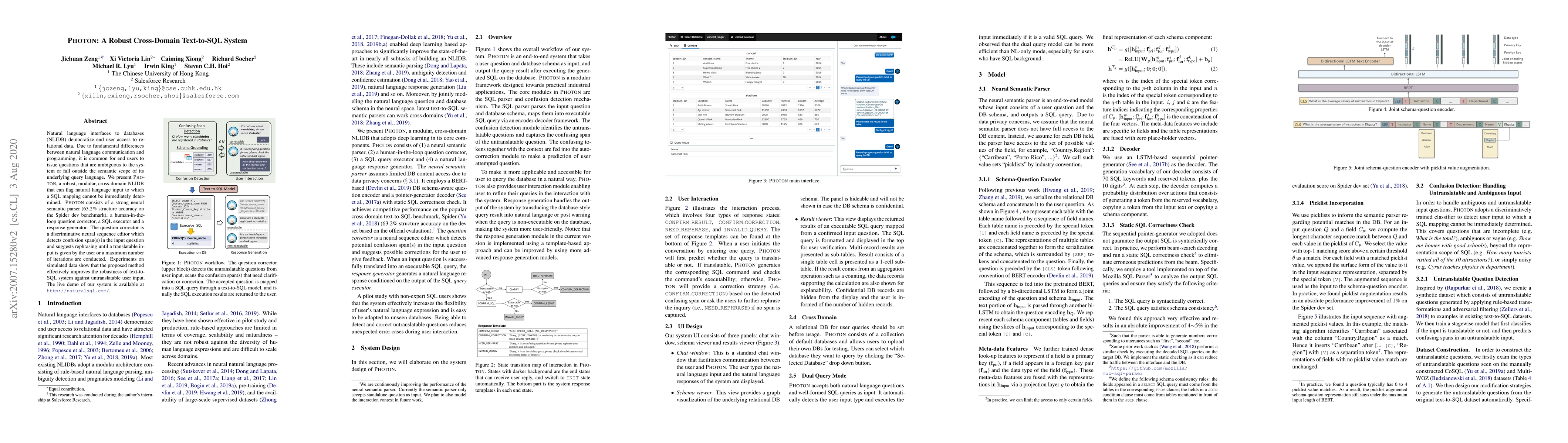 Photon is a robust cross-domain text-to-SQL system that enhances natural language interfaces to databases by flagging ambiguous or untranslatable queries. It employs a neural semantic parser, a human-in-the-loop question corrector, and a SQL executor to improve system robustness against user input outside its semantic scope.