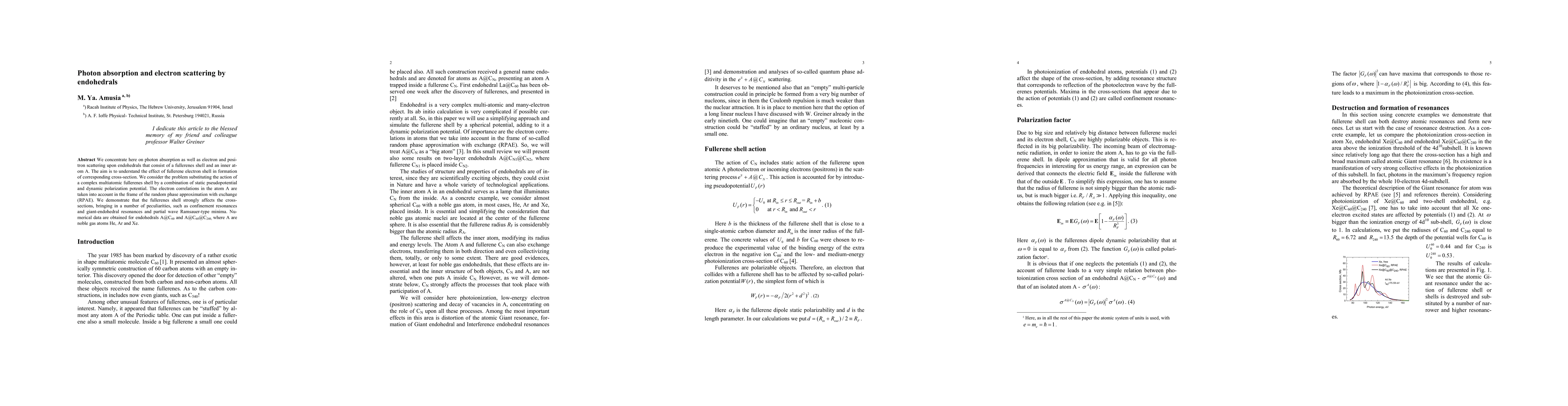 This paper investigates photon absorption and electron/positron scattering on endohedrals, which consist of a fullerene shell and an inner atom A. It demonstrates that the fullerene shell significantly influences cross-sections, introducing unique features like confinement resonances and partial wave Ramsauer-type minima, using RPAE and pseudopotential models. Numerical results are provided for endohedrals with noble gas atoms encapsulated in fullerene shells.