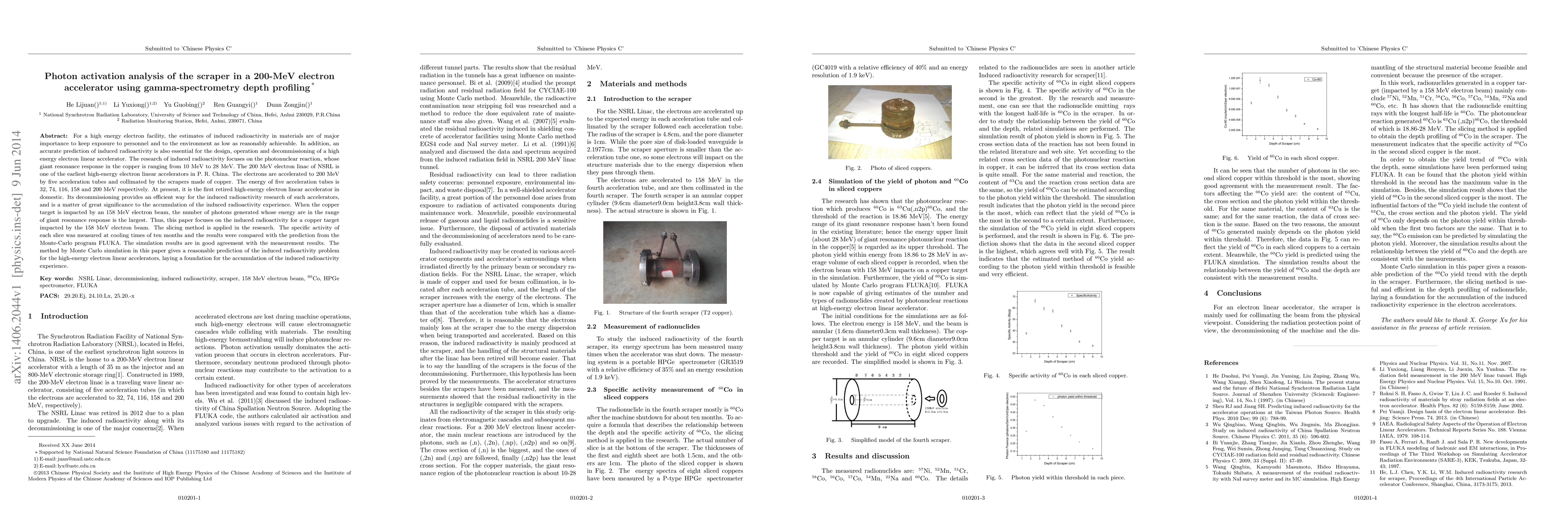 For a high energy electron facility, the estimates of induced radioactivity in materials are of major importance to keep exposure to personnel and to the environment as low as reasonably achievable. In addition, an accurate prediction of induced radioactivity is also essential for the design, operation and decommissioning of a high energy electron linear accelerator. The research of induced radioactivity focuses on the photonuclear reaction, whose giant resonance response in the copper is ranging from 10 MeV to 28 MeV. The 200 MeV electron linac of NSRL is one of the earliest high-energy electron linear accelerators in P. R. China. The electrons are accelerated to 200 MeV by five acceleration tubes and collimated by the scrapers made of copper. At present, it is the first retired high-energy electron linear accelerator in domestic. Its decommissioning provides an efficient way for the induced radioactivity research of such accelerators, and is a matter of great significance to the accumulation of the induced radioactivity experience. When the copper target is impacted by an 158 MeV electron beam, the number of photons generated whose energy are in the range of giant resonance response is the largest. Thus, this paper focuses on the induced radioactivity for a copper target impacted by the 158 MeV electron beam. The slicing method is applied in the research. The specific activity of each slice was measured at cooling times of ten months and the results were compared with the prediction from the Monte-Carlo program FLUKA. The simulation results are in good agreement with the measurement results. The method by Monte Carlo simulation in this paper gives a reasonable prediction of the induced radioactivity problem for the high-energy electron linear accelerators, laying a foundation for the accumulation of the induced radioactivity experience.