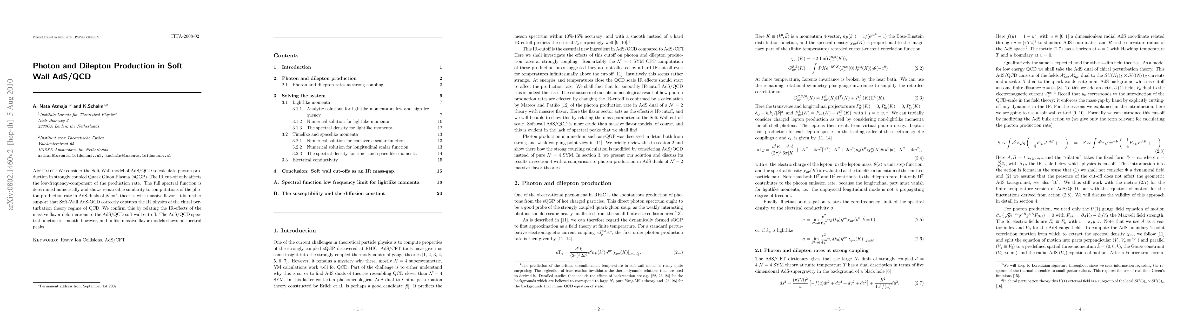 We consider the Soft-Wall-model of AdS/QCD to calculate photon production in strongly coupled Quark Gluon Plasma (sQGP). The IR cut-off only affects the low-frequency-component of the production rate. The full spectral function is determined numerically and shows remarkable similarity to computations of the photon production rate in AdS-duals of $\mathcal{N}=2$ theories with massive flavor. It is further support that Soft-Wall AdS-QCD correctly captures the IR physics of the chiral perturbation theory regime of QCD. We confirm this by relating the IR-effects of the massive flavor deformations to the AdS/QCD soft wall cut-off. The AdS/QCD spectral function is smooth, however, and unlike massive flavor models shows no spectral peaks.