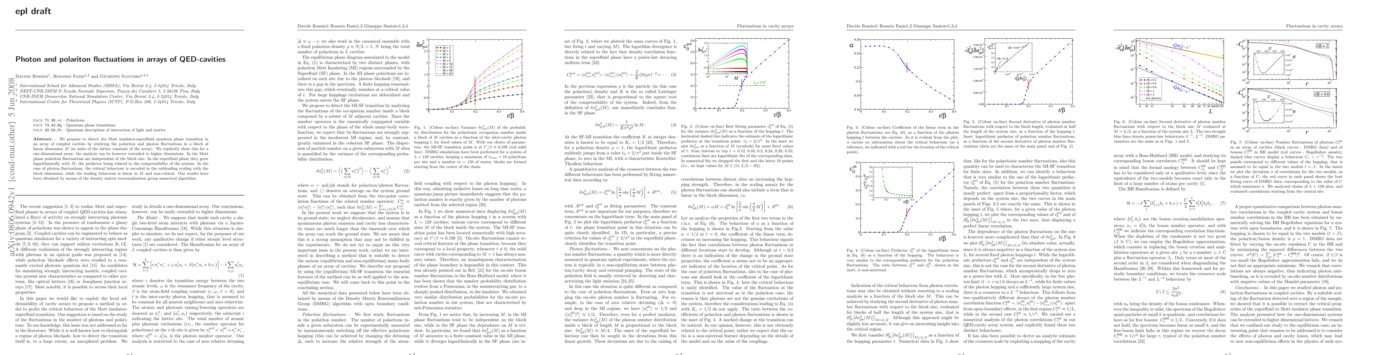 We propose to detect the Mott insulator-superfluid quantum phase transition in an array of coupled cavities by studying the polariton and photon fluctuations in a block of linear dimension M (in units of the lattice constant of the array). We explicitly show this for a one-dimensional array; the analysis can be however extended to higher dimensions. In the Mott phase polariton fluctuations are independent of the block size. In the superfluid phase they grow logarithmically with M, the prefactor being related to the compressibility of the system. In the case of photon fluctuations, the critical behaviour is encoded in the subleading scaling with the block dimension, while the leading behaviour is linear in M and non-critical. Our results have been obtained by means of the density matrix renormalization group numerical algorithm.