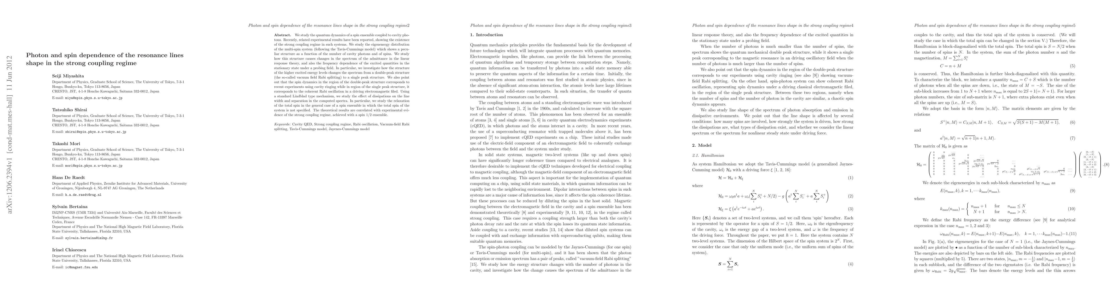 We study the quantum dynamics of a spin ensemble coupled to cavity photons. Recently, related experimental results have been reported, showing the existence of the strong coupling regime in such systems. We study the eigenenergy distribution of the multi-spin system (following the Tavis-Cummings model) which shows a peculiar structure as a function of the number of cavity photons and of spins. We study how this structure causes changes in the spectrum of the admittance in the linear response theory, and also the frequency dependence of the excited quantities in the stationary state under a probing field. In particular, we investigate how the structure of the higher excited energy levels changes the spectrum from a double-peak structure (the so-called vacuum field Rabi splitting) to a single peak structure. We also point out that the spin dynamics in the region of the double-peak structure corresponds to recent experiments using cavity ringing while in region of the single peak structure, it corresponds to the coherent Rabi oscillation in a driving electromagnetic filed. Using a standard Lindblad type mechanism, we study the effect of dissipations on the line width and separation in the computed spectra. In particular, we study the relaxation of the total spin in the general case of a spin ensemble in which the total spin of the system is not specified. The theoretical results are correlated with experimental evidence of the strong coupling regime, achieved with a spin 1/2 ensemble.