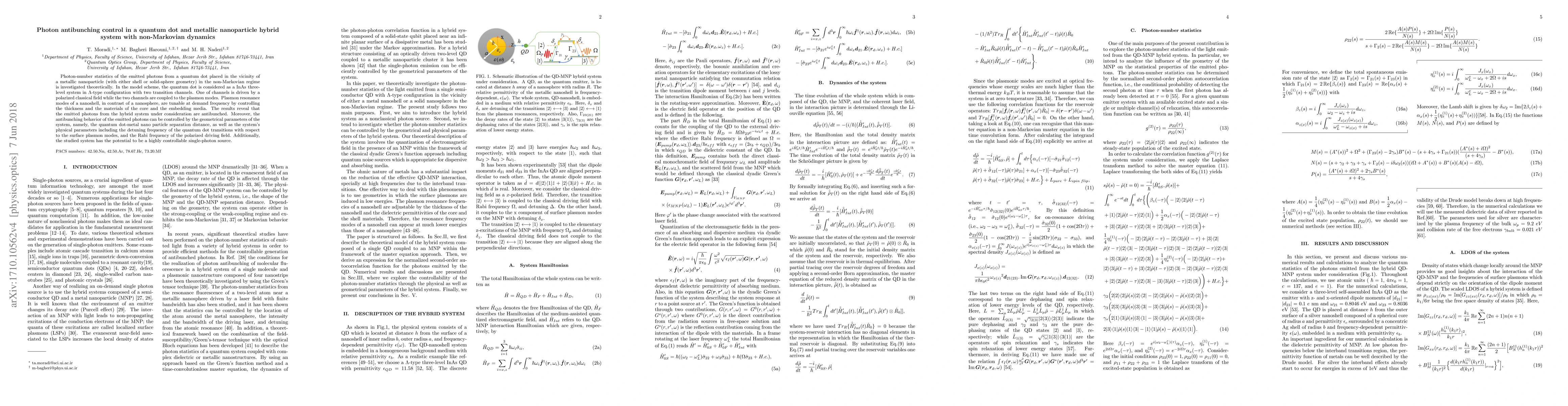 This paper investigates photon-number statistics in a quantum dot-metallic nanoparticle hybrid system under non-Markovian dynamics, revealing antibunching behavior. The control of photon antibunching is achieved through geometrical and physical parameters, suggesting the system's potential as a tunable single-photon source.